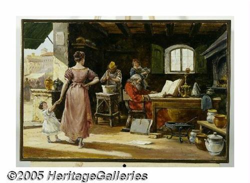 <B>ALDO AFFORTUNATI (Italian b. 1906)</B></I><BR>The Apothecary<BR>Oil on canvas<BR>15.75in. x 23.75in.<BR>Signed lower left<BR>Provenance: Florence Art Gallery, Florence, Italy<BR><BR>Condition Report: Unlined original canvas, dent from beneath canvas top right edge from angled framing nail, small strip of inpainting along top right corner, very small loss along middle left edge inpainted, otherwise very good condition<BR>