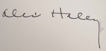 (1921-1992) American novelist, author of the epic fictional history of a black family, Roots. Rare signed book Roots (Garden City: Doubleday & Co., 1976), first edition, inscribed on the front flyleaf: "11/15/76 Susie Chappell - The best to you from Kunta's family! Alex Haley". Last letter in signature slightly feathered, else very good. Slight bit of chipping to printing on spine, spine ends just a bit rubbed, cover lightly soiled, overall very good. With dust jacket.