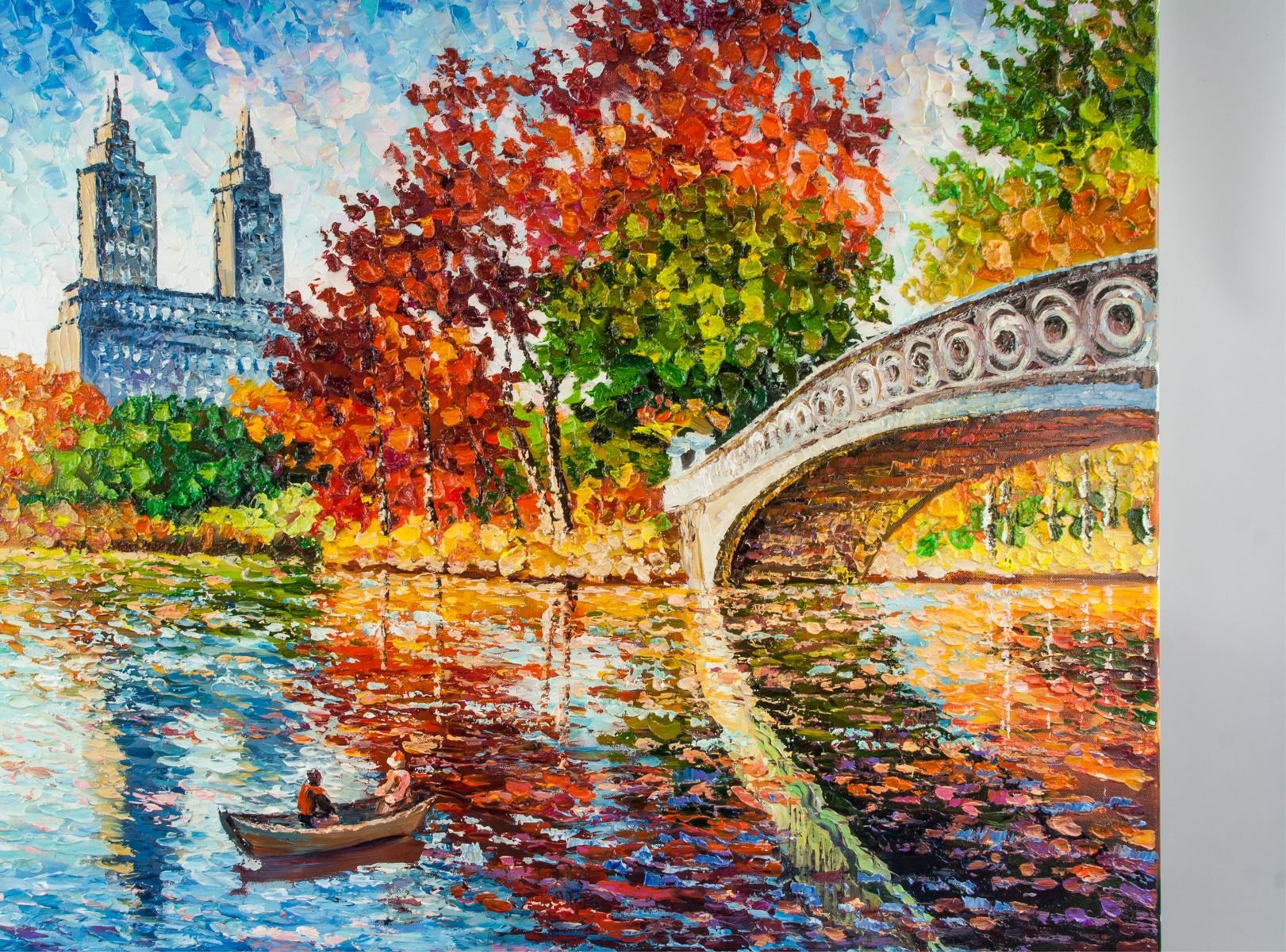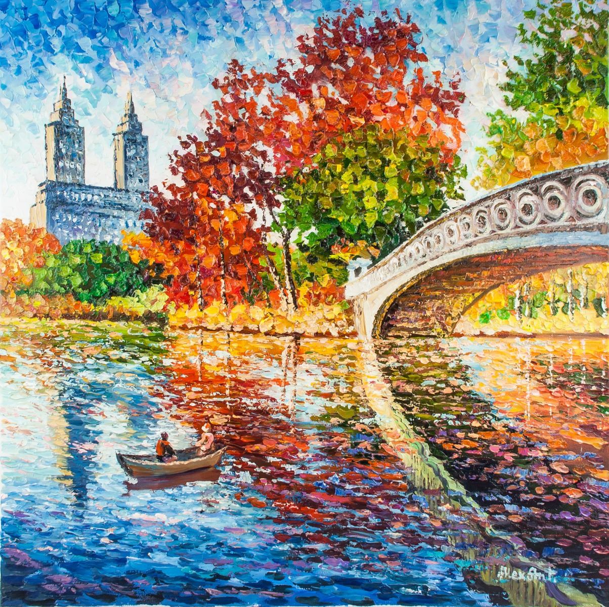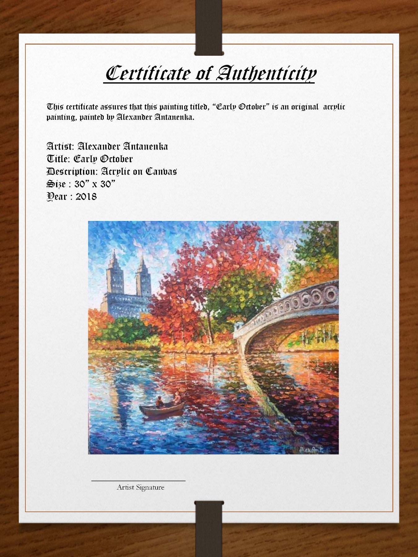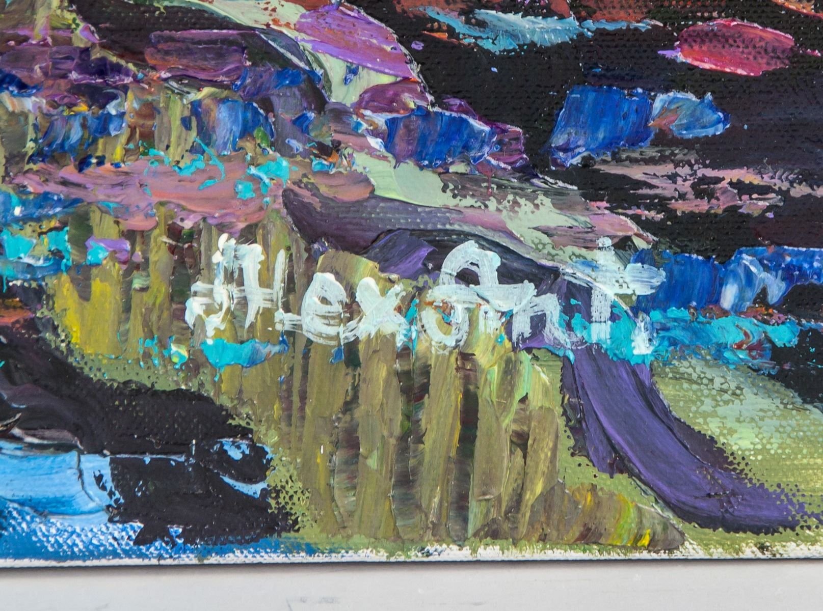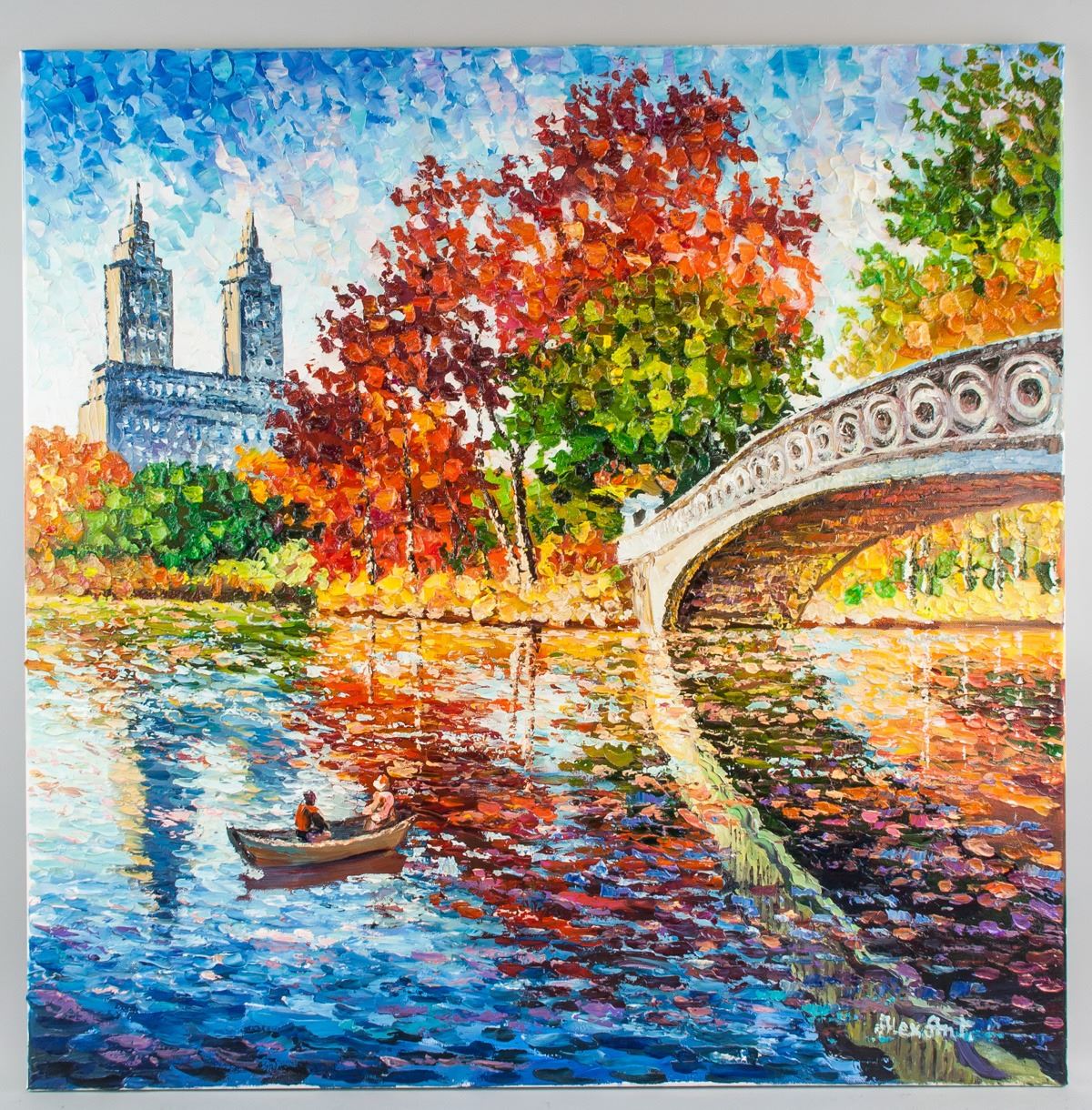 Acrylic on canvas, thickly painted in his characteristic Electric Impressionism. Entitled, "Early October," and dated 2018 on verso. Signed by Alexander Antanenka (Russian-American, b. 1951, based in the United States) on the lower right corner. Accompanied by a certificate signed by the artist. 30 x 30 in. (76 x 76 cm) Alexander Antanenka was born in Brest, Soviet Union on February 16th, 1951 where he attended art school in grade school, he also attended the Art Academy in Leningrad, Russia and graduated at the top of his class in 1978. Antanenka fled to Siberian City of Maganda after his parents were killed in the Chernobyl disaster, and he was displeased with the Soviet governments attempted to cover up this tragic event. Many artists, poets and politicians who did not believe in their governments practice exiled here. Alexander’s work changed while he resided in the city of Maganda and he was able to express his emotions through his artwork. Many Japanese were interested in his art but unfortunately he was unable to have an exhibition because the KGB restricted him. After the fall out of the Soviet he was able to hold his own exhibitions in different cities such as: Maganda in 1990, Vladivostok in 1992, Minsk and Brest in 1996, just to name a few. Alexander now resides in the United States and his artwork is in private collections around the world. PROVENANCE: From the family of the artist.