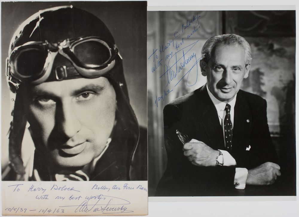 (1894 - 1974) American aviator and aeronautical engineer, founder of Republic Aircraft and maker of the P-47. Lot of two I.S.P.s, the first 7 1/2" x 11" b/w, early pose with aviator's cap, inscription affixed to the bottom of the photo, the second 8" x 10" b/w, 1962. With the original printing plate for the pilot's 1962 Christmas card. Very good.