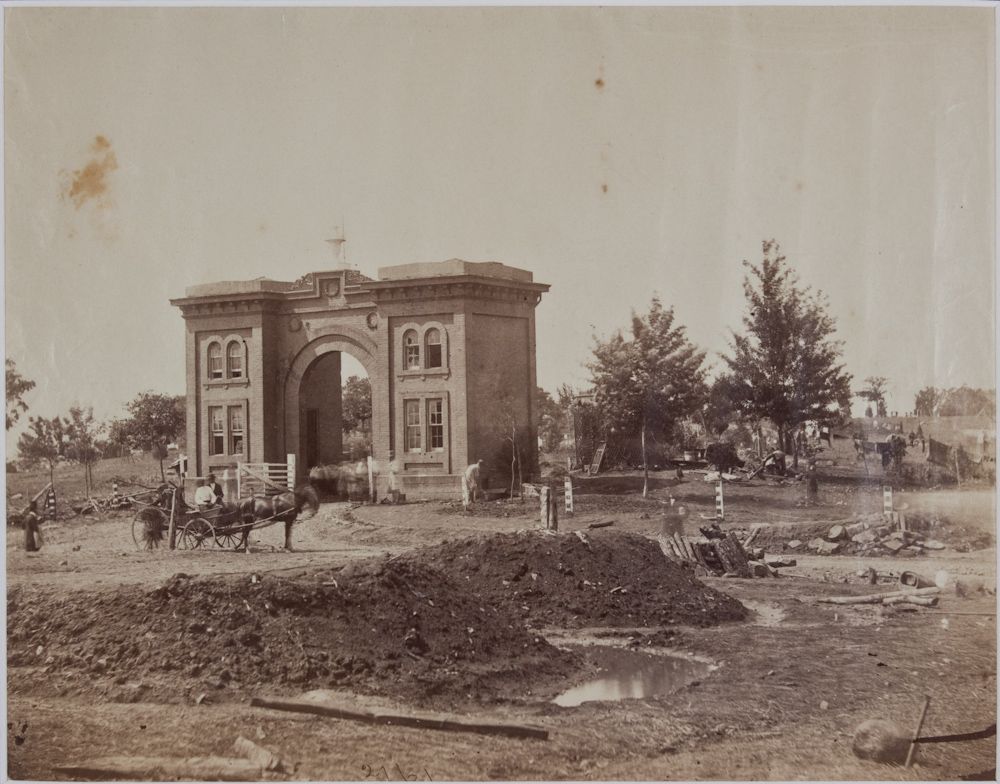 Albumen photograph, 9 x 7 1/4, sepia, a excellent image by Alexander Gardner of the gatehouse taken only days after the battle in July 1863 (note the broken out windows along the right side). The earthworks erected by by Lt. James Stewart's Battery B of the 4th U.S. Artillery are still visible in the foreground. Nominal surface creases, else very good with good contrast. Matted and framed. Not examined out of frame.