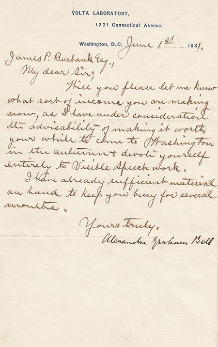 (1847 - 1922) American inventor of the telephone, formed the Bell Telephone Company, and established the Volta Laboratory which produced numerous related inventions and improvements on existing technology. Fine content manuscript L.S. "Alexander Graham Bell" on his "Volta Laboratory" letterhead, 1p. 8vo., Washington, June 1, 1881 to James P. Burbank. In part: "...Will you please let me know what sort of income you are making now, as I have under consideration the advisability of making it worth your while to come to Washington in the autumn to devote yourself to Visible Speech work. I have already sufficient material on hand to keep you for several months...". Fine. In 1880, Bell was awarded the Volta Prize of $50,000 francs (approx. $10,000) by the French government for his invention of the telephone. He then established the Volta Laboratory Association with the intention of furthering research into ways to aid the deaf. "Visible Speech", invented by Bell's father, was a shorthand and teaching technique in which every sound was represented by a symbol, with the intention of helping the deaf to speak by putting these sounds together. Fine condition. Interestingly, Burbank was one of Bell's first pupils in lip-reading, and two years earlier had published Principles of Elocution, with Exercises and Notations for Pronunciation, Intonation, Emphasis, Gesture and Emotional Expressions.