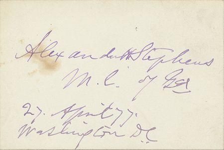 (1812 - 1883) Vice President of the Confederacy who urged moderation and negotiation with the Union. War-date A.L.S., 3pp. 8vo., Crawfordville, May 7, 1862 to his nephew. Signature on a small card, in full: "Alexander H. Stephens M. C. of Ga. 27 April 77 Washington D.C.". A small stain at top left, else very good.