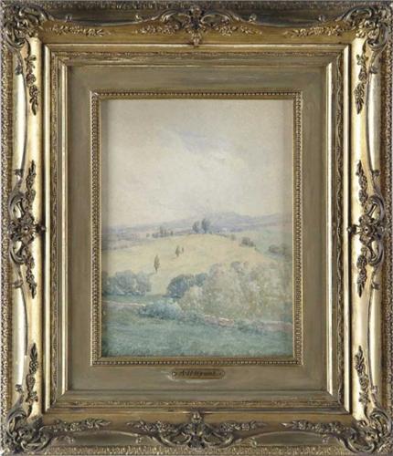 ALEXANDER HELWIG WYANT (American, 1836-1892) SUMMER HILLSIDE. Fine watercolor landscape scene shows a grass covered hillside bordered by trees. Foreground crossed by a stone wall. Signed lower left "AH Wyant 1872". Housed in what appears to be its original gesso decorated pierced fancy frame with gold liner having artist plaque. SIGHT SIZE: 9-3/4" x 7-1/4". CONDITION: Very good. 9-27736