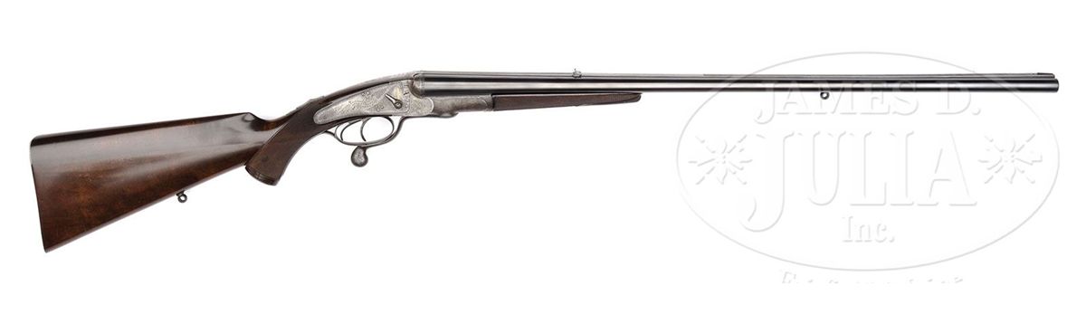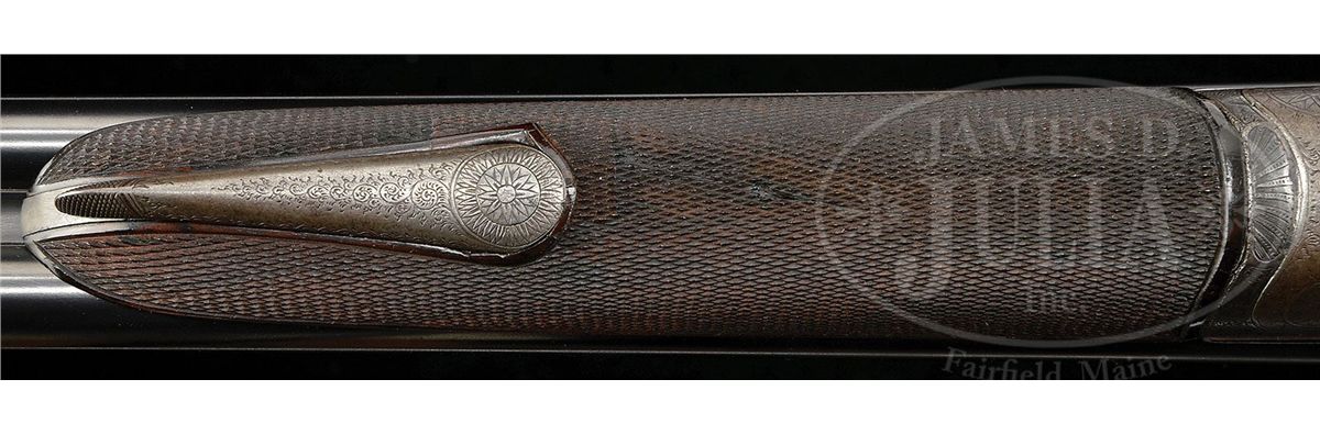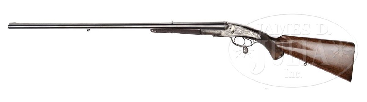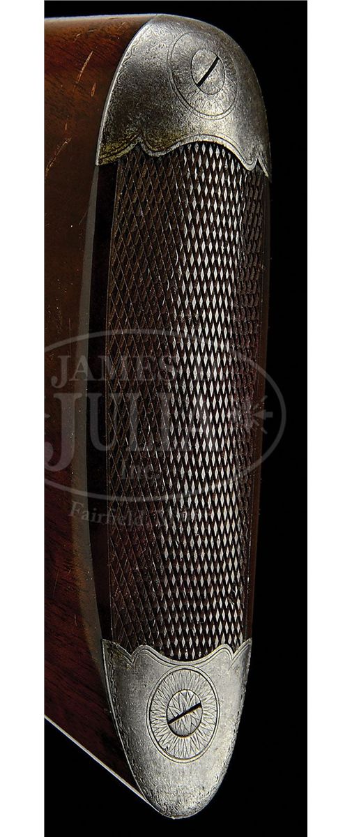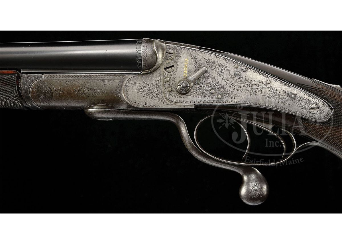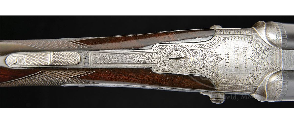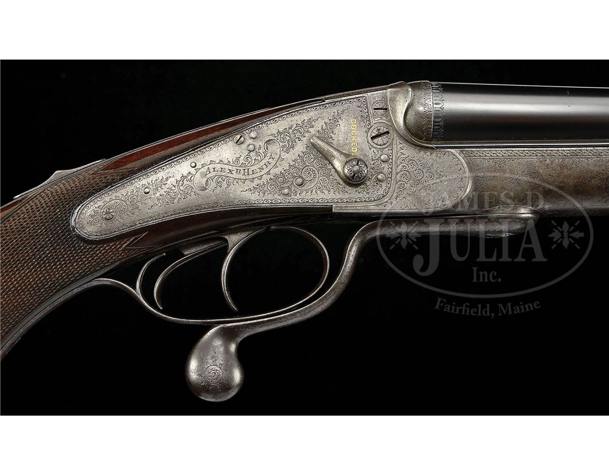 SN 6473. (1891) Cal. .450 BPE. 28" Dovetailed bbls have full length file cut rib, engraved "Alexr Henry Edinburgh & London." and mounted with one standing, one folding express rear sight and longitudinally dovetailed front bead. Bbl flats are stamped with London black powder proofs, SNs, "AH" and "450 EX". Jones under lever hammerless action (operation of under lever cocks locks) is fitted with back action hammerless locks and features automatic safety and long armed cocking indicators, which cover a gold inlaid "COCKED" when in fired position. Action has well filed fences and is engraved with 60% coverage well cut small scroll. "Alexr Henry" is on scrolled ribands on each lockplate. Top of action is engraved "Henry's Patent no. 207". Trigger guard with central portion of bow cutaway to accept operating lever, has SN at grip. Lightly figured European walnut full horn capped pistol grip buttstock measures 14-9/16" over checkered wood butt with engraved steel heel and toe plates. Point pattern checkering is at grip, and a sling eye is on toe line. Matching splinter forend is fully checkered, and has front pivoting release. Drop at heel: approx 3", drop at comb: approx 1-15/16". Weight: 8 lbs. 9 oz. LOP: 14-9/16". CONDITION: Very good, as partially refinished. Bbls retain nearly all of a high quality satin re-blue, engraving picked up. Action and lockplates are mostly pewter gray patina. Wood refinished, and retains nearly all of that finish with a number of minor marks. Checkering is re-cut and sharp. Bores have strong rifling throughout, but are frosted with some pitting. Action is slightly loose. Bbls are off face. These scarce sporting rifles often show heavy use, as they were taken to the "ends of the earth" mostly in sultry, tropical environments. 4-48314 MGM73