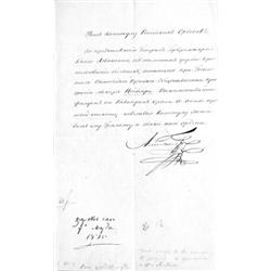 ALEXANDER I: (1777 - 1825) Russian Czar whose greatest achievement was the destruction of the armies under Napoleon leading to the abdication of the Emperor and Russian participation in the Congress of Vienna. Manuscript D.S. as Tsar, 1p. sm. folio, [n.p.], 1825, an award of the Medal of Saint Anna, Third Degree to a Dr. Tseidler in recognition of his great service. Near fine. $300-500