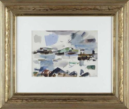 ALEXANDER MINEWSKI (American, 1917-1979) ABSTRACT HARBOR SCENE. Watercolor on paper scene shows boats in what appears to be a bridge and dock area. Signed lower right "Minewski". Housed in a fine gilt reeded edge carved frame with white matte. SIGHT SIZE: 9-1/2" x 13-1/2". CONDITION: Very good. 9-27621