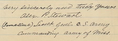(1821-1908) Confederate major generawho commanded at Shiloh, Chickamauga and Atlanta, and replaced Polk after that general's death. Fine sentiment and signature on an oblong 12mo. sheet, in full: "very sincerely and truly yours Alex P. Stewart (sometime) Lieut. Genl. C.S. Army Commanding Army of Miss.". Mounted, near fine condition.