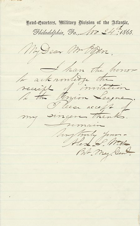(1835 - 1911) Union brigadier general who held the "Bloody Angle" against Pickett's charge at Gettysburg. Brief A.L.S. 1p. 8vo., Philadelphia, Nov. 24, 1865, on letterhead of the Military Division of the Atlantic to Mr. Ogden, acknowledging receipt of an invitation. With original postal cover, very good.