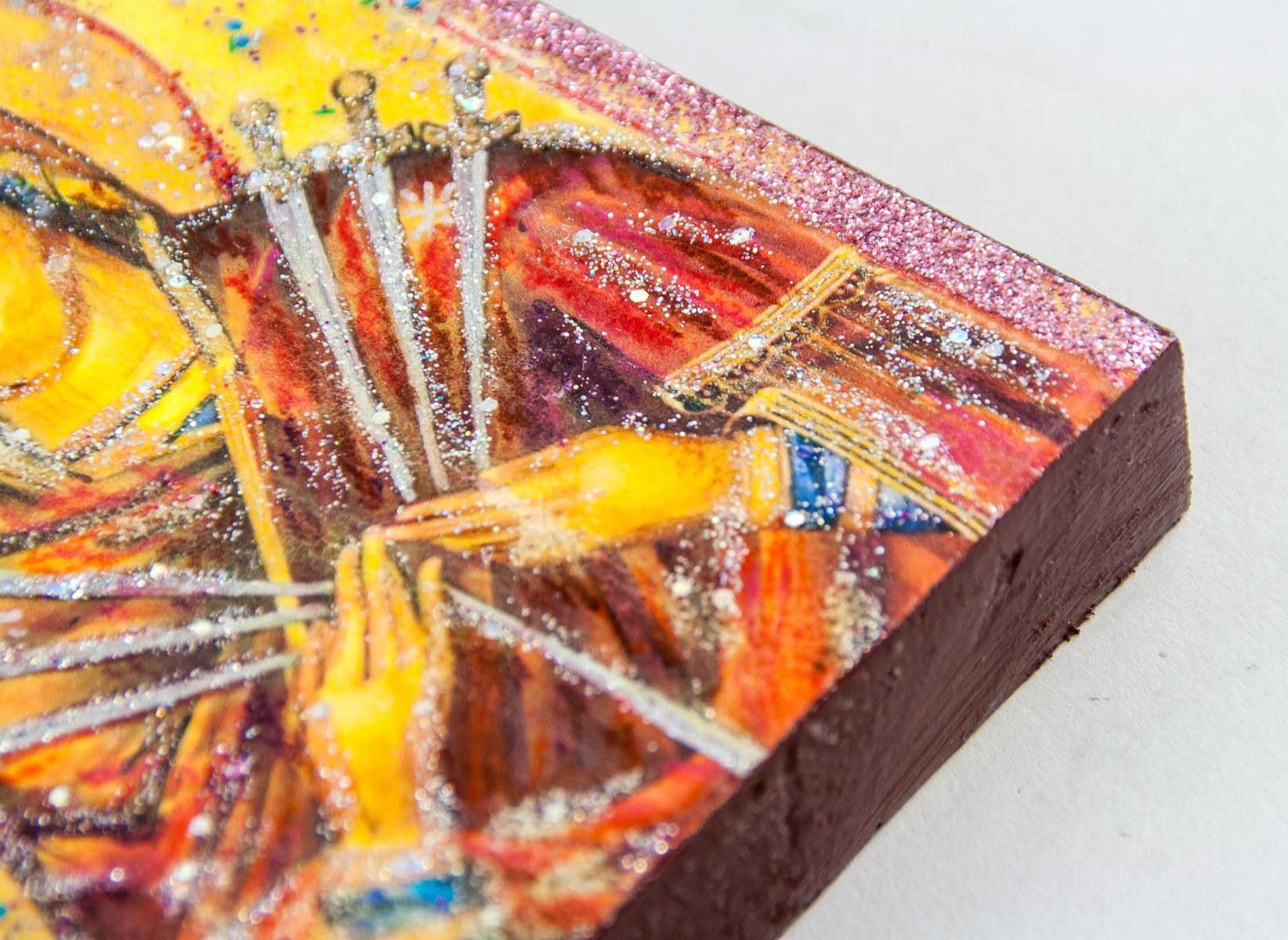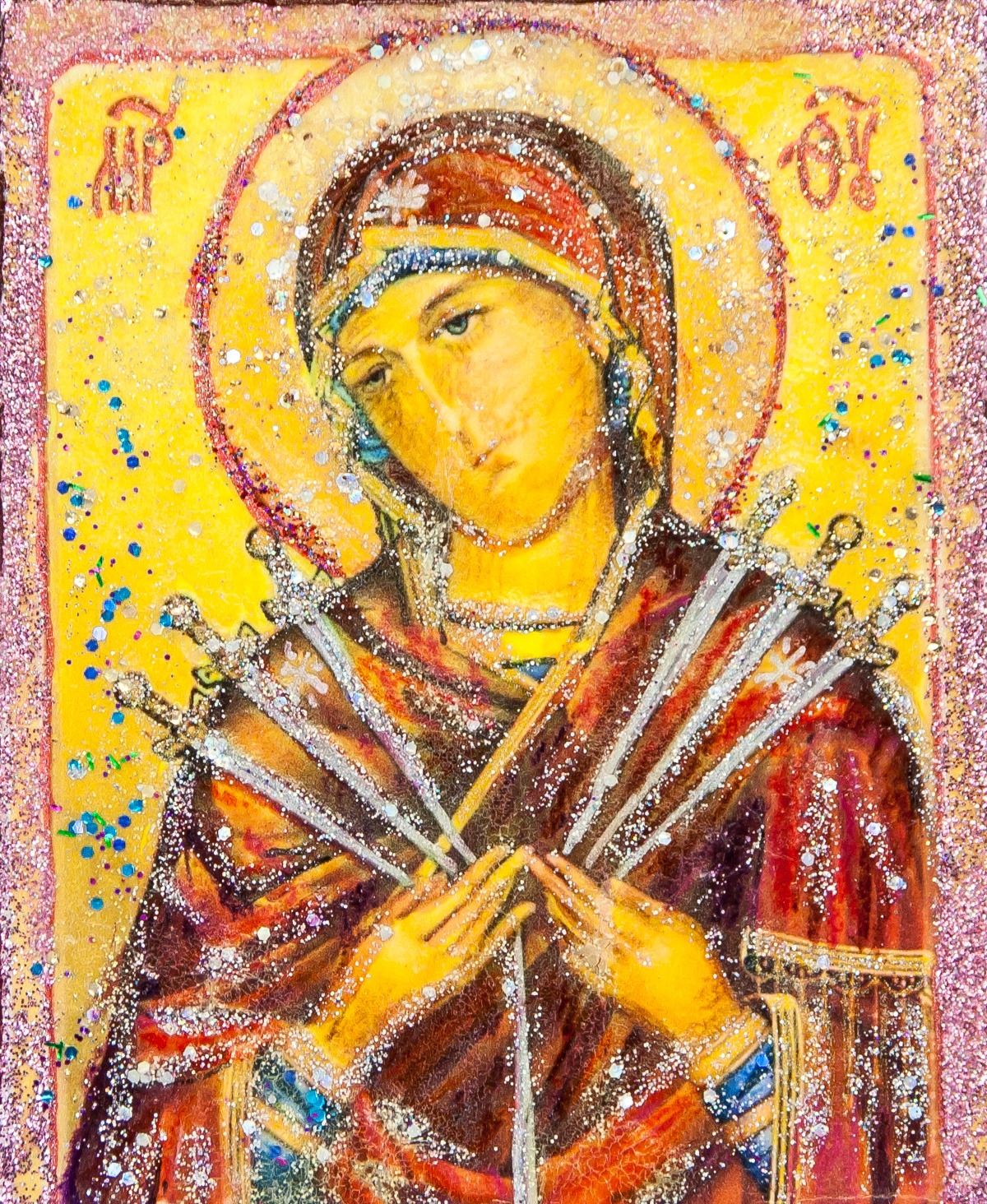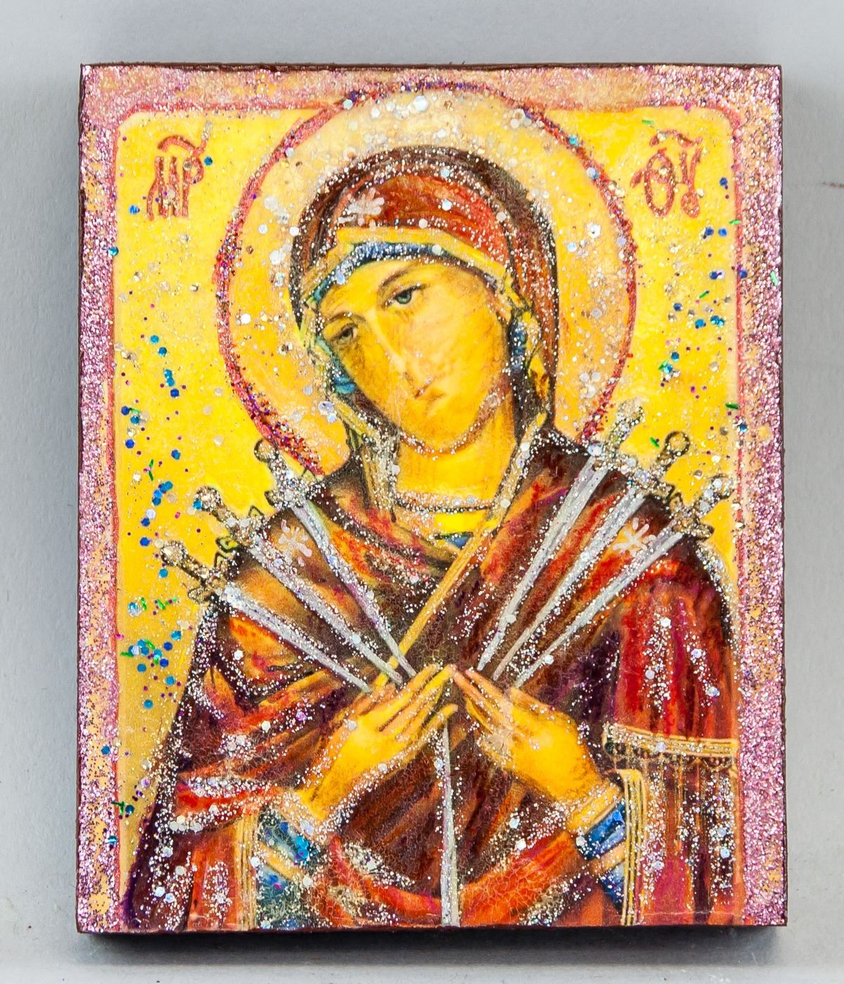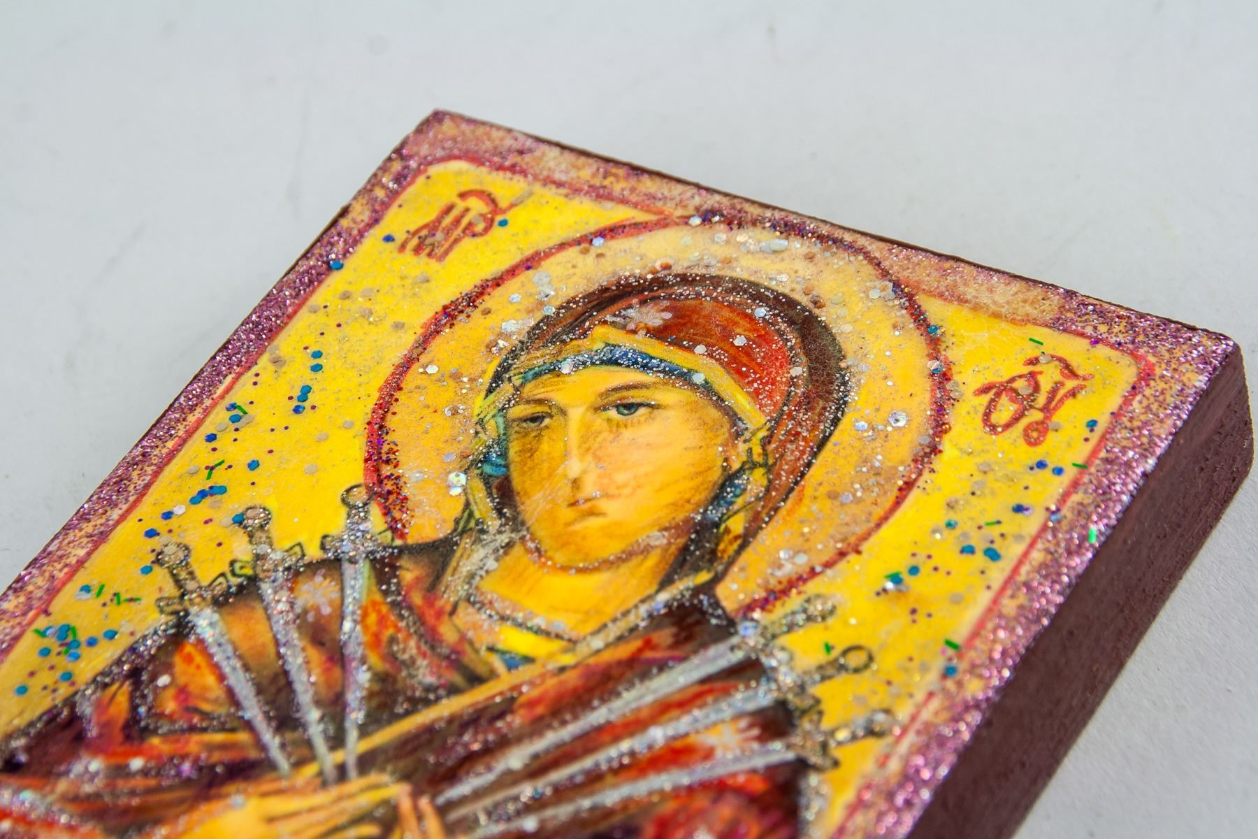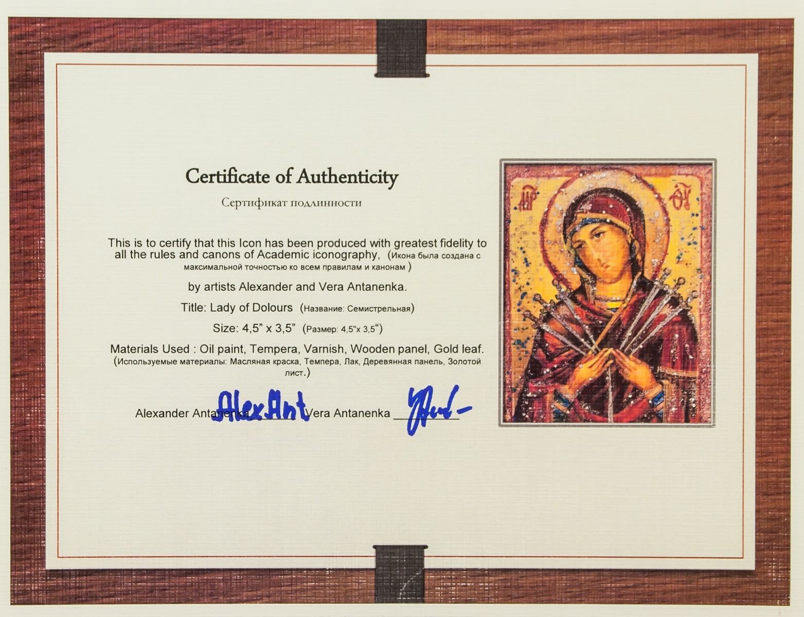 Mixed media on wood panel, featuring Lady of Dolours, with certificate of authenticity offered and signed by artists Alexander Antanenka (b.1951, Russian) and Vera Antanenka, accompanied with plastic stand, 10.7 x 8.5 cm (4.5 x 3.5 inches)