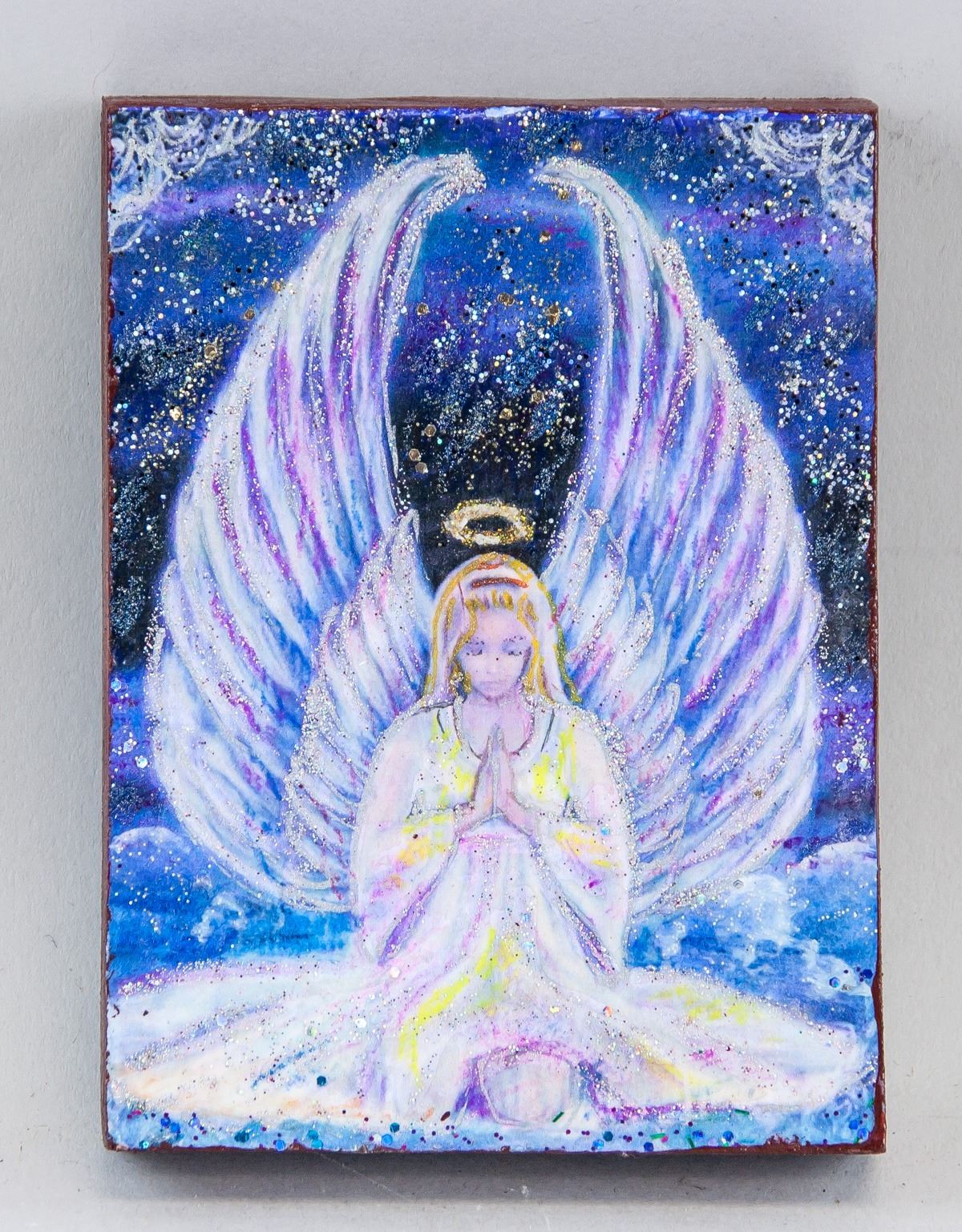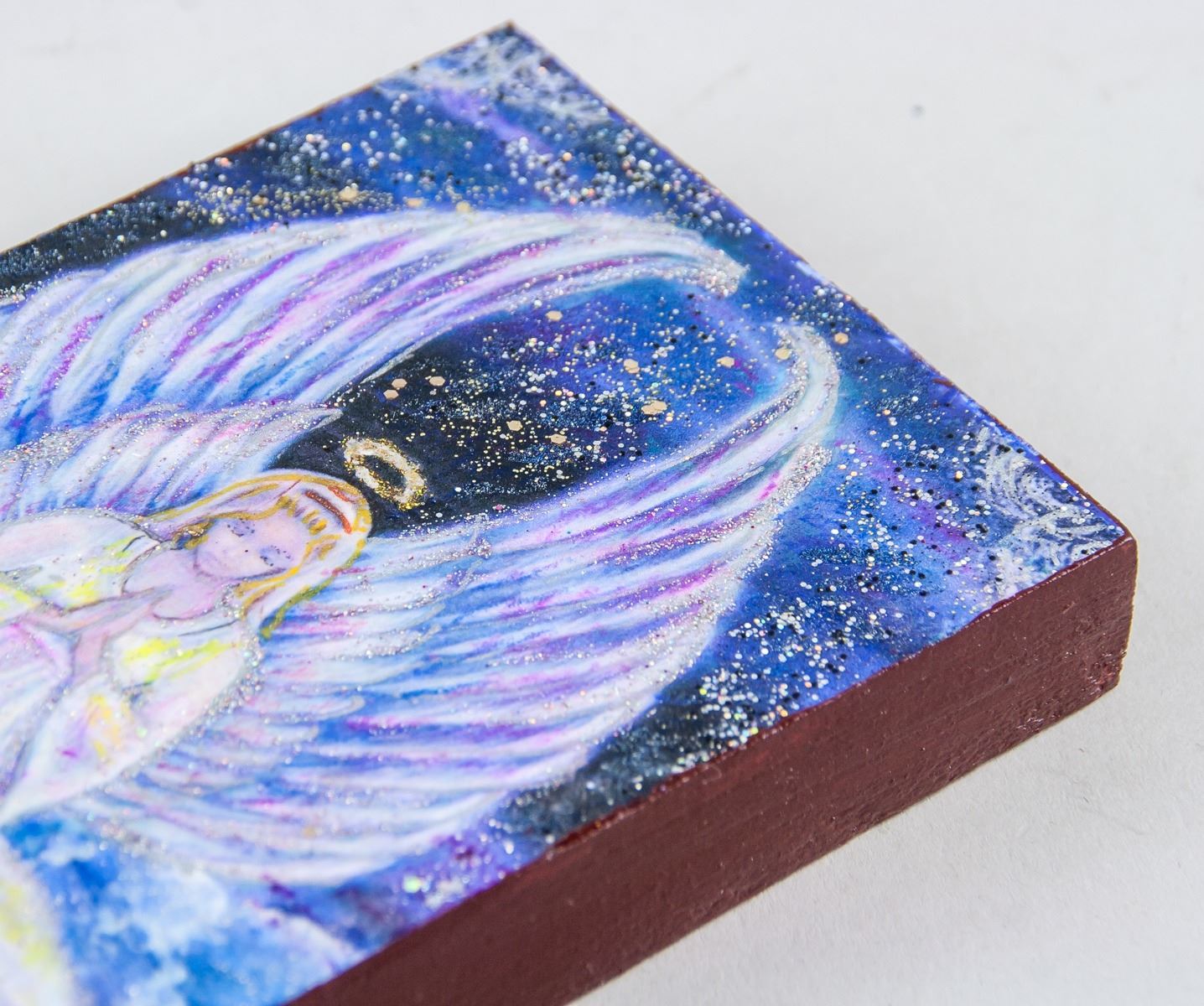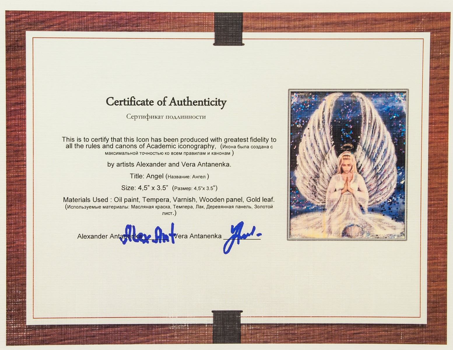 Mixed media on wood panel, featuring angel, with certificate of authenticity offered and signed by artists Alexander Antanenka (b.1951, Russian) and Vera Antanenka, accompanied with plastic stand, 11.2 x 8.6 cm (4.5 x 3.5 inches)