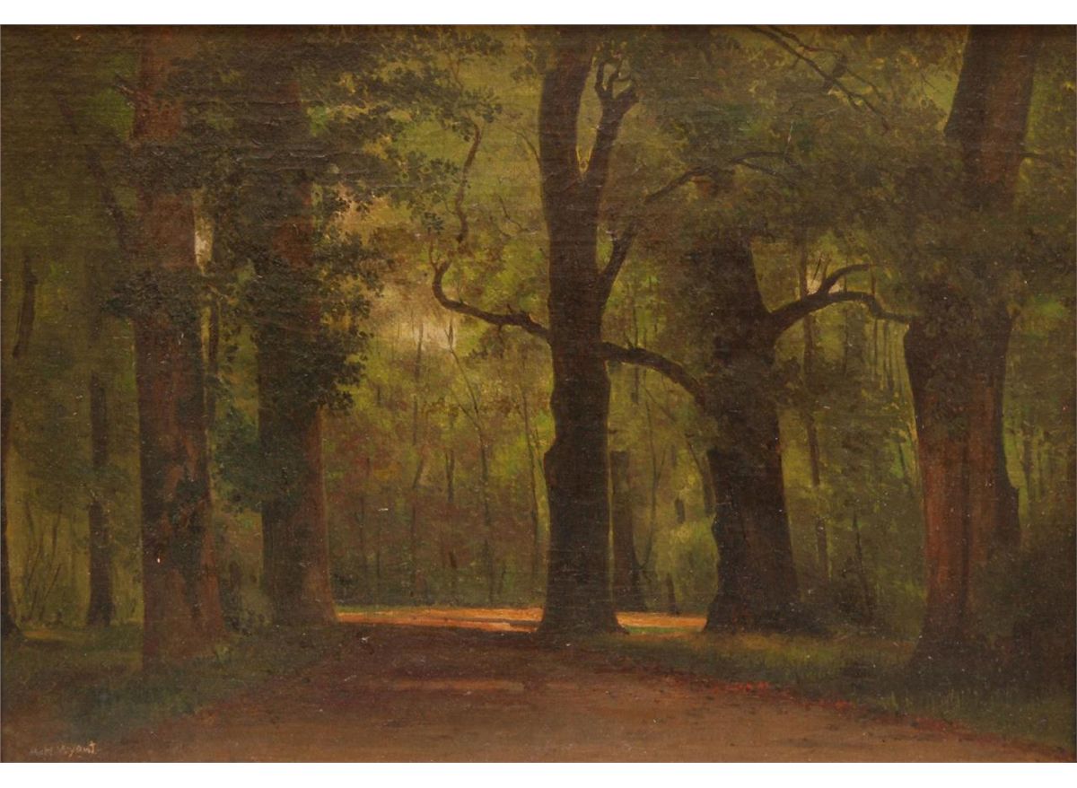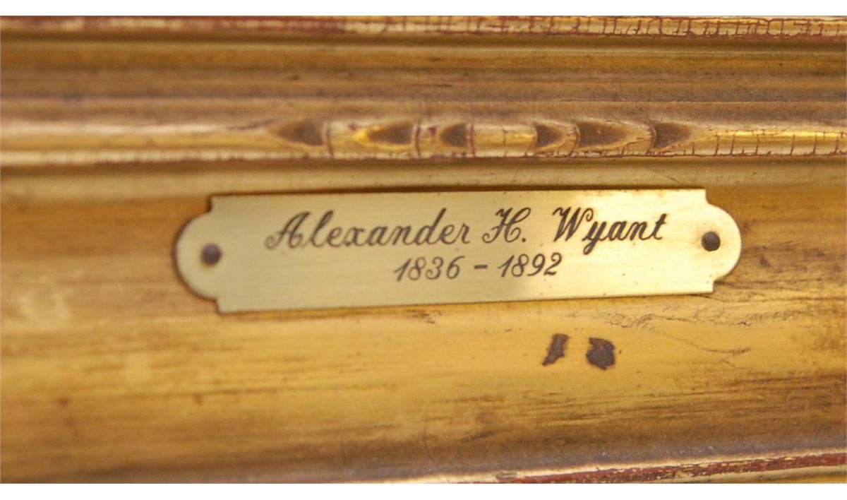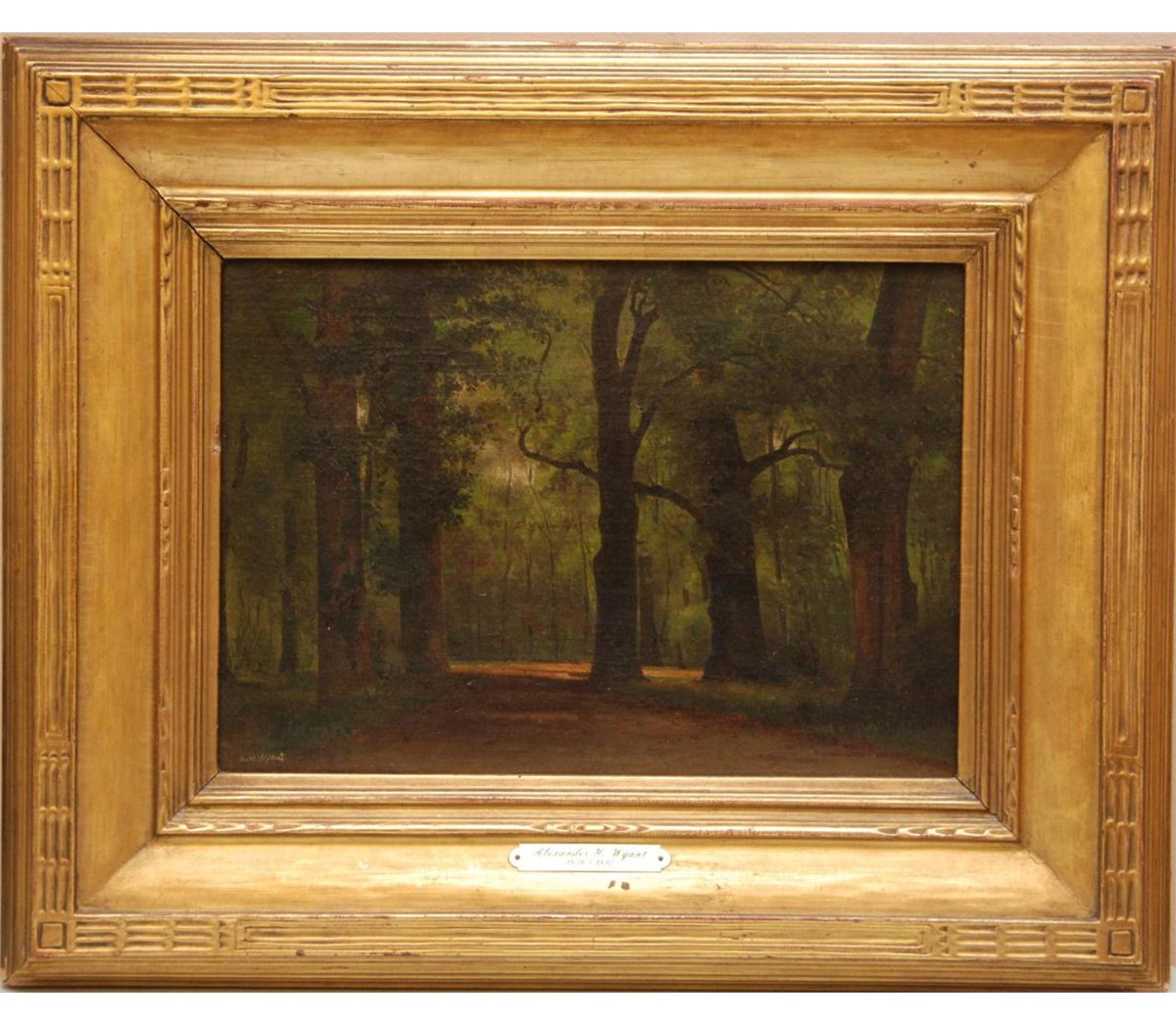 Alexander Helwig Wyant (AMERICAN, 1836-1892) oil painting on canvas depicting a forest scene. Signed 'A. H. Wyant' to lower left. Mounted in gilded frame with plaque to lower center. Measures 10 3/8" height x 14 5/8" width + 3 5/8" frame (26.3cm x 37.1cm + 9.2cm). Provenance: Sam Feldman Collection.