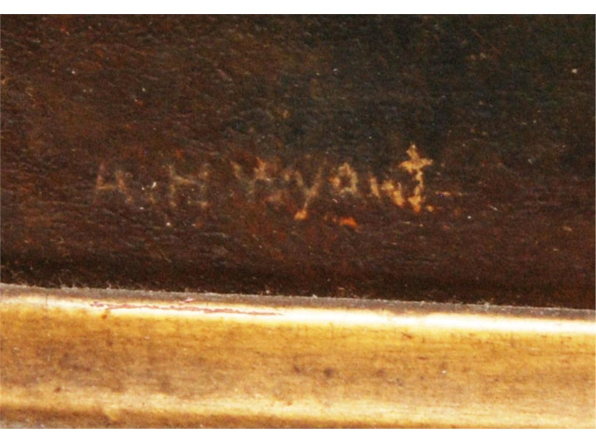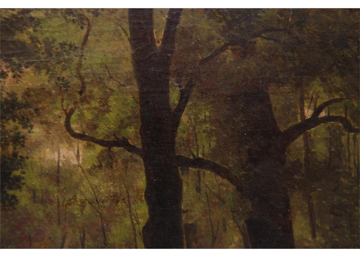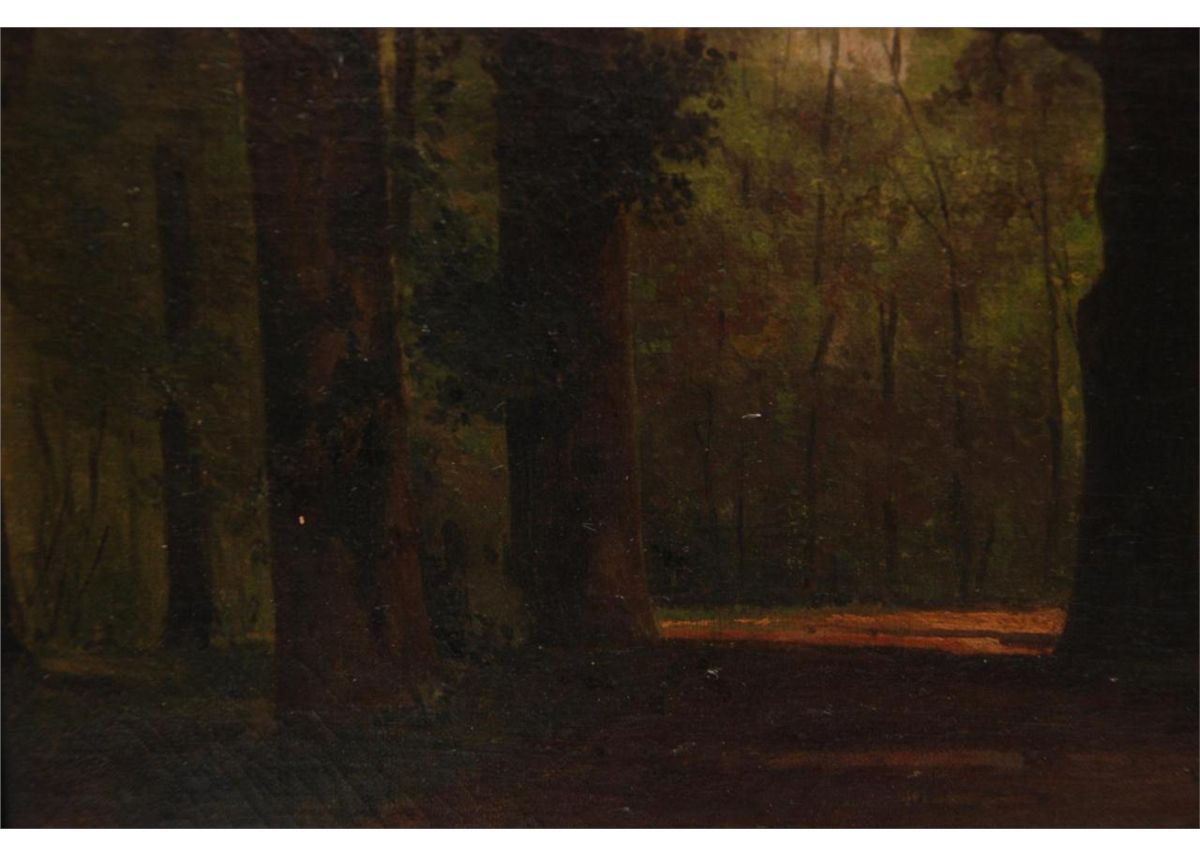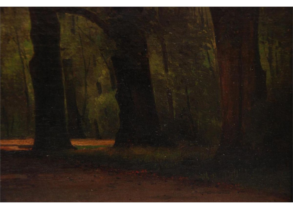 Alexander Helwig Wyant (AMERICAN, 1836-1892) oil painting on canvas depicting a forest scene. Signed 'A. H. Wyant' to lower left. Mounted in gilded frame with plaque to lower center. Measures 10 3/8" height x 14 5/8" width + 3 5/8" frame (26.3cm x 37.1cm + 9.2cm). Provenance: Sam Feldman Collection.