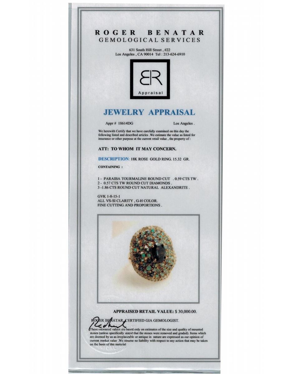 ALEXANDRITE 1.86CT / PARAIBA TOURMALINE 0.57CT / DIAMOND 0.57CT / 18K ROSE GOLD RING 15.32GRAM / GVK1/8/15(1)