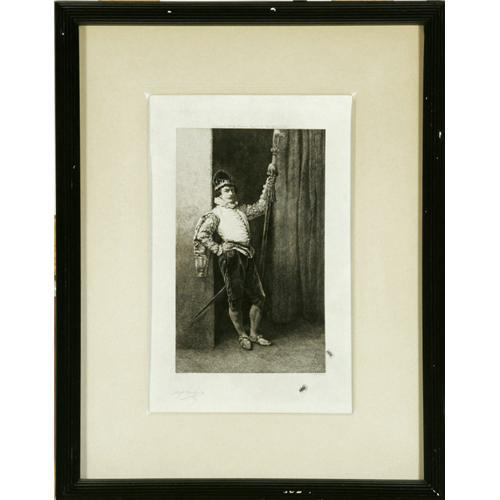 <B>ALF BOILOT (French, 1889)</B></I><BR>Man with Staff<BR>Etching<BR>9 x 13.5in.<BR>Signed lower left<BR>Inscribed top margin: Copyrighted 1889 by Frederick Keppel & Co. New York and Paris<BR> 1 Items <BR><BR><B>Condition Report:</B> Excellent condition, frame in good condition with minor chipping