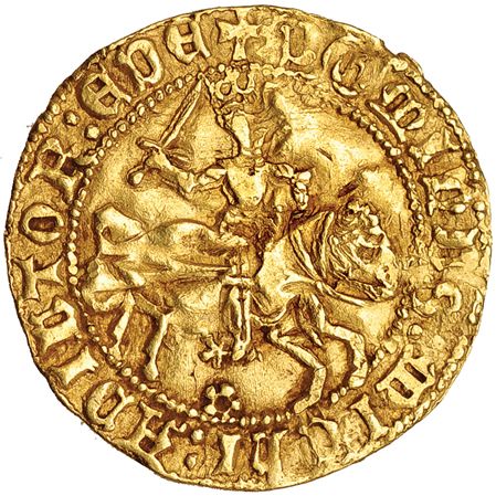 ALFONSO DE ÁVILA. 1/2 dobla. (1465-1468). Toledo. A/ El monarca a caballo con espada y yelmo coronado, debajo florón: +dominUs: michi: adiUtor: ede.R/ +ALFONSUS :DEI: GRACIA:REXCA: III-842. MBC+. Rarísima. MBC+.