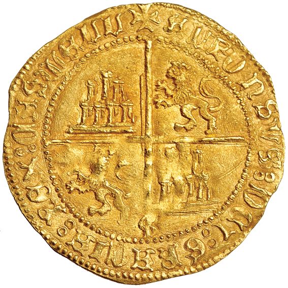 ALFONSO DE ÁVILA. Dobla. (1465-1468). Sevilla. A/ Ley.: +DOMINVS: MI-CHI. ADIVTOR: ET: NOM:TIM. R/ S en la parte inferior del eje vertical; +ALFONSVS: DEI: GRACIA: REX: CASTELL. III-839. Acuñación algo floja. EBC-. Rarísima con la marca de ceca en esta p