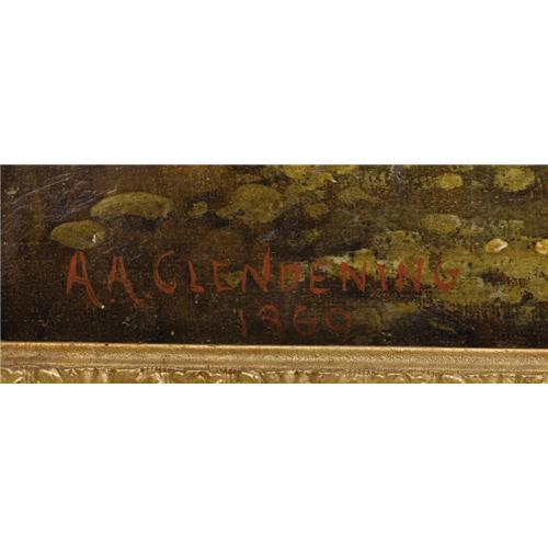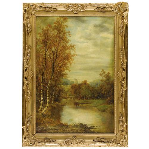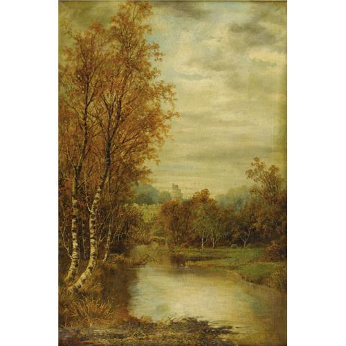 <B>ALFRED AUGUSTUS GLENDENING</B></I> (British circa 1840-circa 1910)<BR><I>Autumn Landscape With Pond And Castle Tower,</B></I> 1869<BR>Oil on canvas<BR>29-1/2 x 19-1/4 inches (74.9 x 48.9 cm)<BR>Signed and dated lower left:<I> A. A. Glendening/1969</B></I><BR><BR> <B>Condition Report:</B> In unlined original condition; normal signs of wear as appropriate with age including scattered strengthening in the sky and a 1-1/2 x 2 inch area in the top left corner; a 5 inch vertical repair left of center and a 5 (vertical) x 3 (horizontal) x 4 (vertical) repair also left of center; approximate 1 x 1 inch area of strengthening lower center; verso with three support patches; craquelure throughout and minor surface dirt.<BR><BR><b>Shipping:</b> Requires 3rd Party Shipping (<a target="_blank" href="http://www.heritageauctions.com/common/shipping.php">view shipping information</a>)