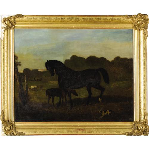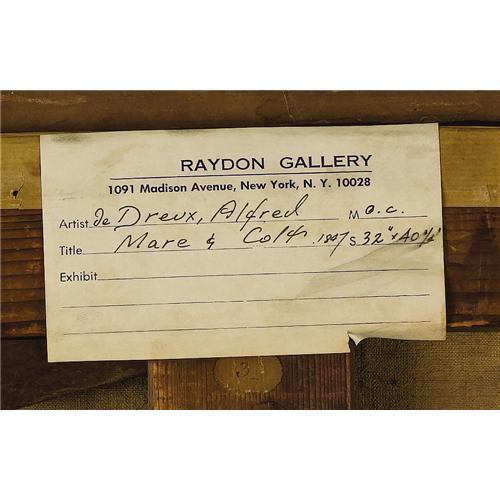 <B>ALFRED DE DREUX</B></I> (French 1810-1860)<BR><I>Mare And Colt,</B></I> 1847<BR>Oil on canvas<BR>32 x 40-1/2 inches (81.3 x 102.9 cm)<BR>Signed and dated lower left: <I>A. de Dreux 1847</B></I><BR><BR>Alfred de Dreux was a celebrated animal painter specializing in romantic, glamorous horse portraits and scenes of the hunt for over thirty years. His marvelous understanding of animal anatomy and behavior won him many fashionable commissions, and his works form part of museum collections worldwide including the Louvre, Paris, the Hermitage, St. Petersburg, the Musee Camondo, Paris and museums in Bordeaux, Dijon and Chantilly. The attitude of the mother to her colt in this painting is characteristic of the painter's sensitivity to and mastery of his subject.<BR><BR>The son of an architect, de Dreux enjoyed a colorful and privileged life. He first studied under Leon Cogniet and then entered the atelier of the distinguished and versatile painter, Eugene Isabey. Throughout his career, however, de Dreux's work was greatly influenced by Theodore Gericault, who was a close friend of his uncle. In 1831, de Dreux exhibited <I>Interieur d'Ecurie</B></I> at the Paris Salon, which won him immediate fame. From 1840, de Dreu began his celebrated series of portraits of horses from the famous stables of the duc d'Orleans.<BR><BR>Following the Revolution in 1848, the French royal family emigrated to England where de Dreux frequently visited them, painting many equestrian portraits of the exiled King Louis-Philippe and his sons. He returned to France and was commissioned to paint a portrait of Napoleon III in 1859 (Musee de l'Armée, Paris). A dispute arose over this equestrian portrait and in March 1860 de Dreux was killed in a duel by Comte Fleury, Napoleon's principal aide-de-camp.<BR><BR><BR><BR><b>Shipping:</b> Requires 3rd Party Shipping (<a target="_blank" href="http://www.heritageauctions.com/common/shipping.php">view shipping information</a>)