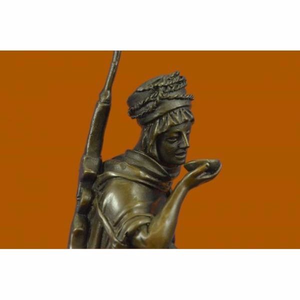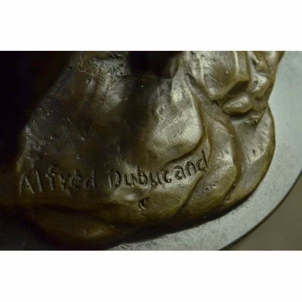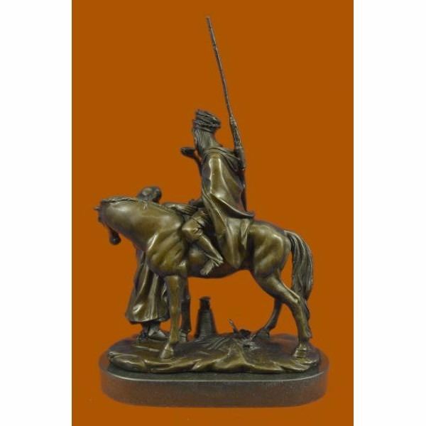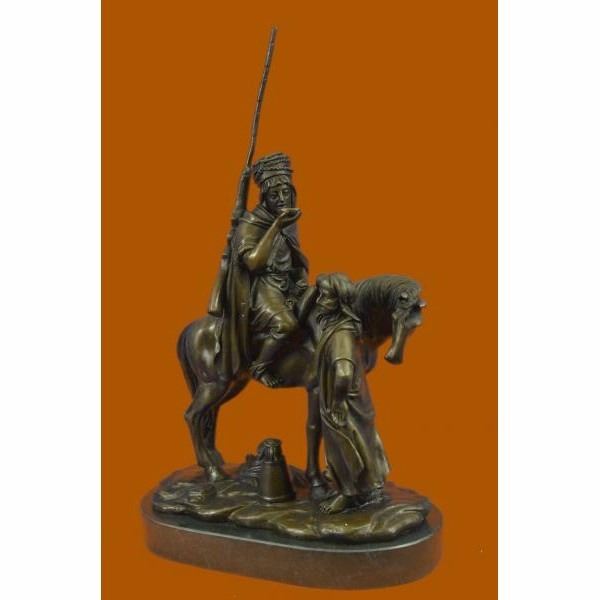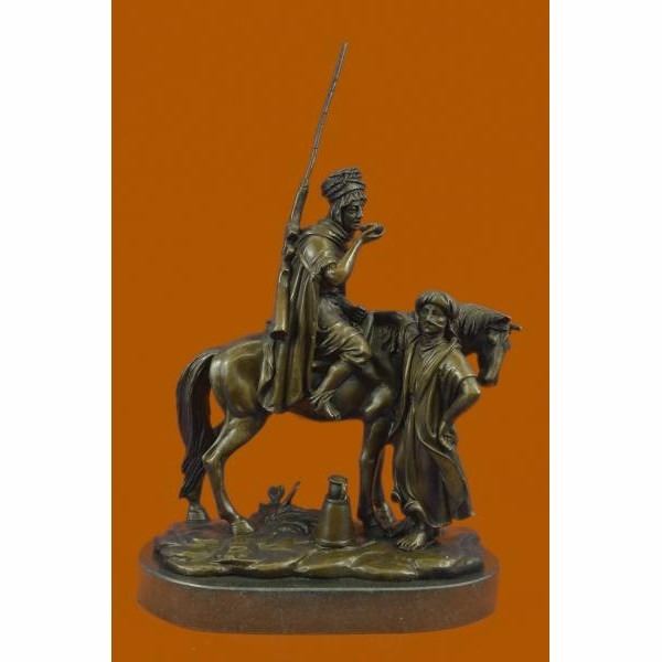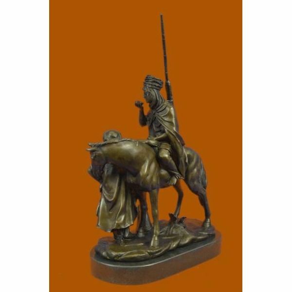 This is a stunning quality genuine hot cast bronze depicting an orientalist subject, a man on horseback. The man is drinking from a cup given to him by the woman stood by the horse. Measures 16" high, 10" wide and is 5.5" deep, this piece weighs 17 Lbs before packing. The piece is very finely detailed and is finished on a solid marble base. The base is signed Alfred Dubucand, however this is not an original of his work but a recent reproduction. Condition: This sculpture is in perfect condition. Bronze Dimensions with Marble Base:Height 16" x Width 10" Marble Dimensions: Diameter 10" . Height without base: 15" Weight : 17 LBS Inventory 81FT0148818