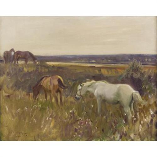<B>ALFRED JAMES MUNNINGS (British, 1878-1959)</B></I><BR><I>Horses Grazing</B></I>, 1916<BR>Oil on canvas<BR>16 x 20 inches (40.6 x 50.8 cm)<BR>Signed and dated lower left: <I>A.J. Munnings 1916</B></I><BR> <BR>PROVENANCE:<BR>Frost and Reed, London (label verso);<BR>Private collection, New York.<B>Condition Report:</B> Canvas has been relined, otherwise good condition.<BR><BR><b>Shipping:</b> Requires 3rd Party Shipping (<a target="_blank" href="http://www.heritageauctions.com/common/shipping.php">view shipping information</a>)