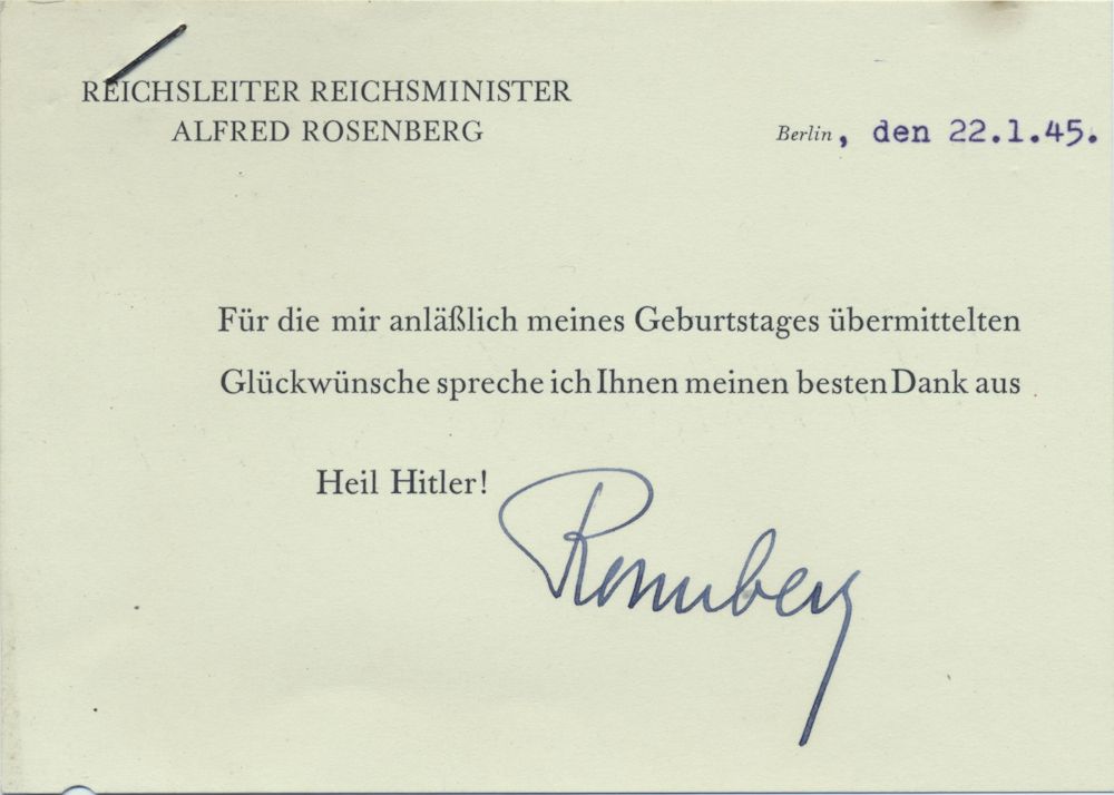 (1893 - 1946) Nazi leader considered the ideologist of Nazism, Reichsminister of the eastern territories, executed at Nuremberg. Printed D.S. on his Reichsleiter Reichsminister correspondence card, 1p. 16mo., Berlin, Jan. 22, 1945, acknowledgement and thanks for birthday wishes sent to him, boldly signed at bottom. Staple hole at top, else fine. From a group of correspondence belonging to Minister of Propaganda Joseph Goebbels.