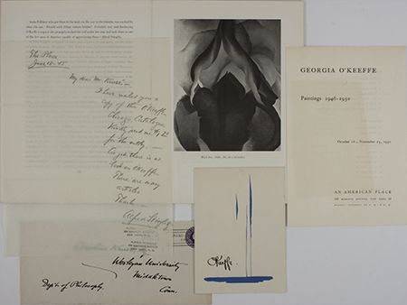 (1864 - 1946) American photographer who was instrumental over his fifty-year career in making photography an acceptable art form alongside painting and sculpture. Also known for his marriage to painter Georgia O'Keeffe. A.L.S. in pencil on onionskin paper, 1p. 4to., New York, June 18, 1945 to Cornelius Kruse regarding his wife's art, in part: "...I have mailed you a copy of the O'Keeffe Chicago Catalogue. Kindly send me $1.70 for the outlay. As yet there is no book on O'Keeffe...". Along with the catalog mentioned, an invitation to said event, and a list of paintings exhibited at An American Place in New York, 1950. Very good.