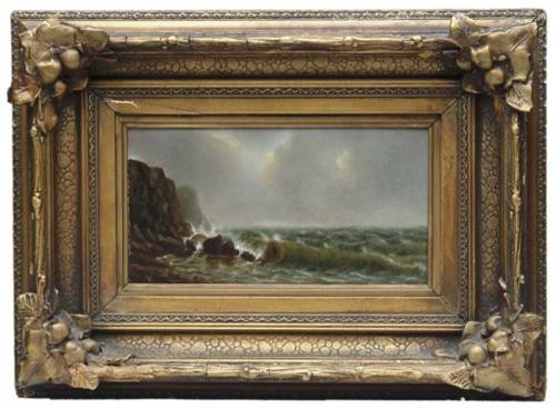 ALFRED THOMPSON BRICHER (American, 1837-1908) "STORMY SURF, GRAND MANAN". Oil on board coastal scene shows waves crashing against rocky cliffs and beach. Gray clouds with a hint of blue. Signed lower left with conjoined first initials "ABricher". Titled and dated "1875" on back. Housed in a good gesso decorated antique frame. SIZE: 5" x 9". CONDITION: Some inpainting, very good. 9-27135