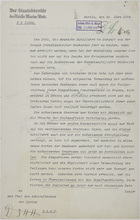 (1849 - 1930) German admiral, Secretary of State of the German Imperial Naval Office. Tirpitz took the modest imperial navy and starting in the 1890s turned it into a world-class force that could threaten the British Royal Navy. Typed D.S. on his State Secretary of the Reichsmarine letterhead, 2pp. legal folio, Berlin, Mar. 21, 1908 to the Chief of Staff of the Admiralty discussing which type of compass markings would be used on admiralty maps as German nautical charts use a compass rose using degrees while other charts used degrees and lines. Tirpitz asks that one uniform compass rose be used for the entire High Fleet. Very good.