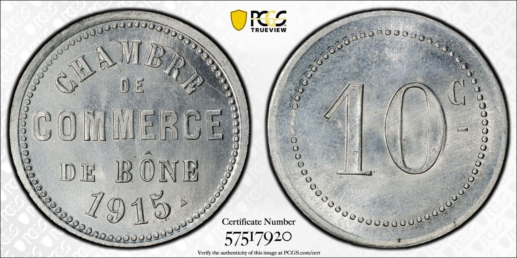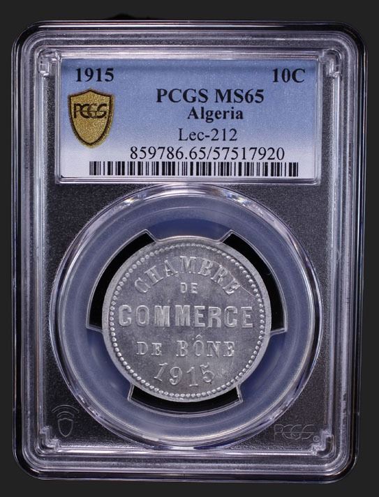 ALGERIA: 10 centimes, 1915, KM-TnB3, Lec-212, Bône Chamber of Commerce, a superb mint state example! PCGS graded MS65.