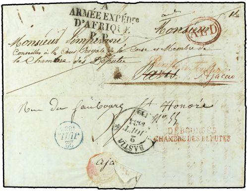 1833 (15 Jul.) Folded letter from ALGERIA, sent to PARIS and redirected to CORSICA. Front shows very fine ´A/ARMEE EXPED´E/D´AFRIQUE/P.P. cachet of Military Post Office, red oval AED handstamp, plus cursive PURIFIE A TOULON desinfection cachet in red. Reverse bears fine red DEBOURSES/CHAMBRE DEPUTES. Despite minor faults, a very rare desinfection Armée Port Payée letter with ´Bureaux Spéciaux´ Déboursé marking.