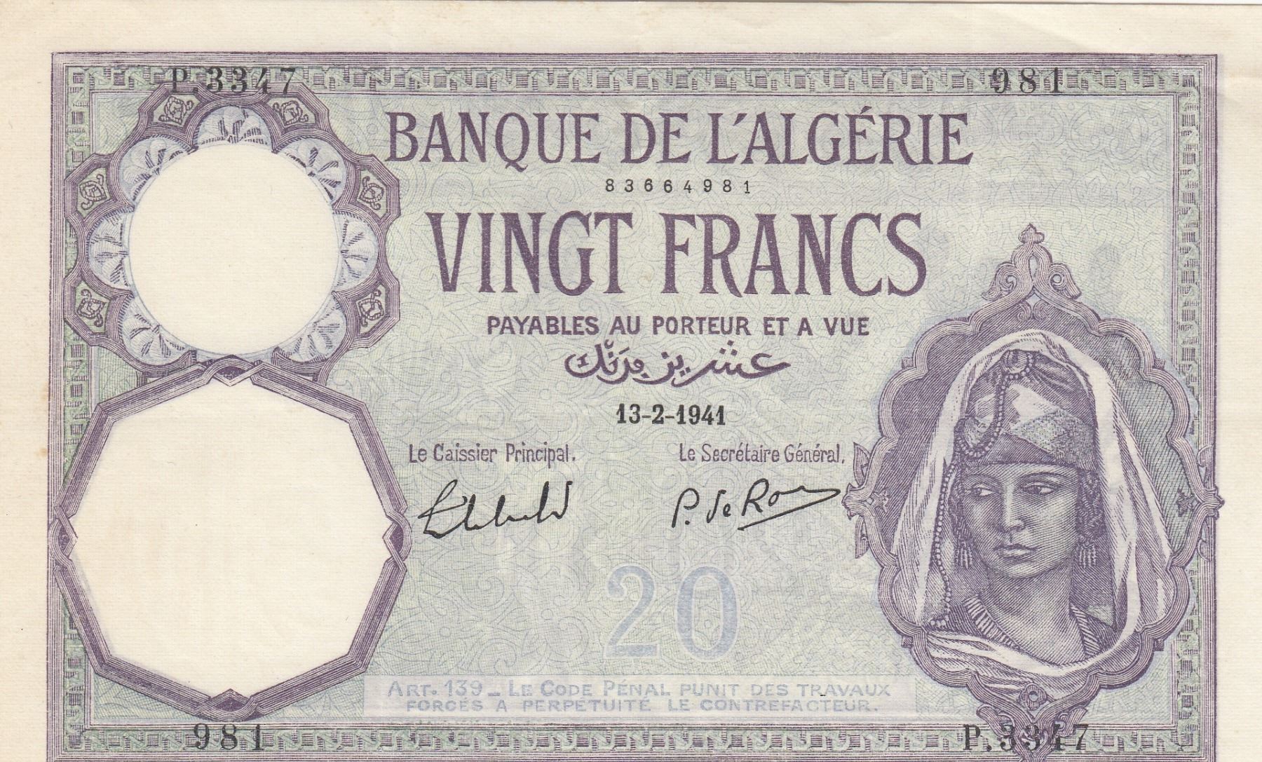 Algeria, 20 Francs, 1941, AUNC, p78c