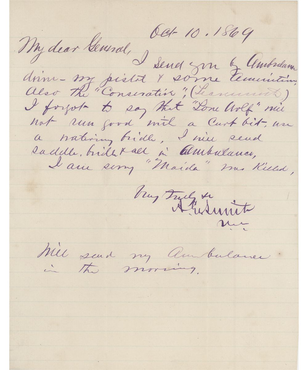 (1842 - 1876) American military officer, first lieutenant of Co. E in the Dakota Column of the 7th Cavalry, killed near Custer but away from his immediate command. Rare, fine association A.L.S. A. E. Smith", 1p. 4to., [Fort Leavenworth], Oct. 10, 1869 to Gen. George A. Custer. In part: "...My dear General, I send you by Ambulance...my pistol & some ammunition. Also the 'Conservative' (Leavenworth). I forgot to say that 'Lone Wolf' will not run good with a curt bit, use a watering bridle. I will send saddle, bridle & all in Ambulance. I am sorry 'Maida' was killed...". With holograph transmittal envelope addressed to Custer (hand delivered). Very good. Custer travelled with his two Scottish staghounds, Maida and Blucher. Blucher was killed by Indians at the Battle of the Washita, Maida during a buffalo hunt.
