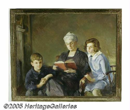 <B>ALICE KENT STODDARD (American )</B></I><BR>A Bedtime Story<BR>Oil on canvas<BR>44in.x 54in.<BR>Signed lower right<BR><BR>Condition report: Canvas has been lined and restretched on new stretcher, right eyes of boy and grandmother overpainted, inpainting in face of girl, extensive scattered inpainting throughout<BR>