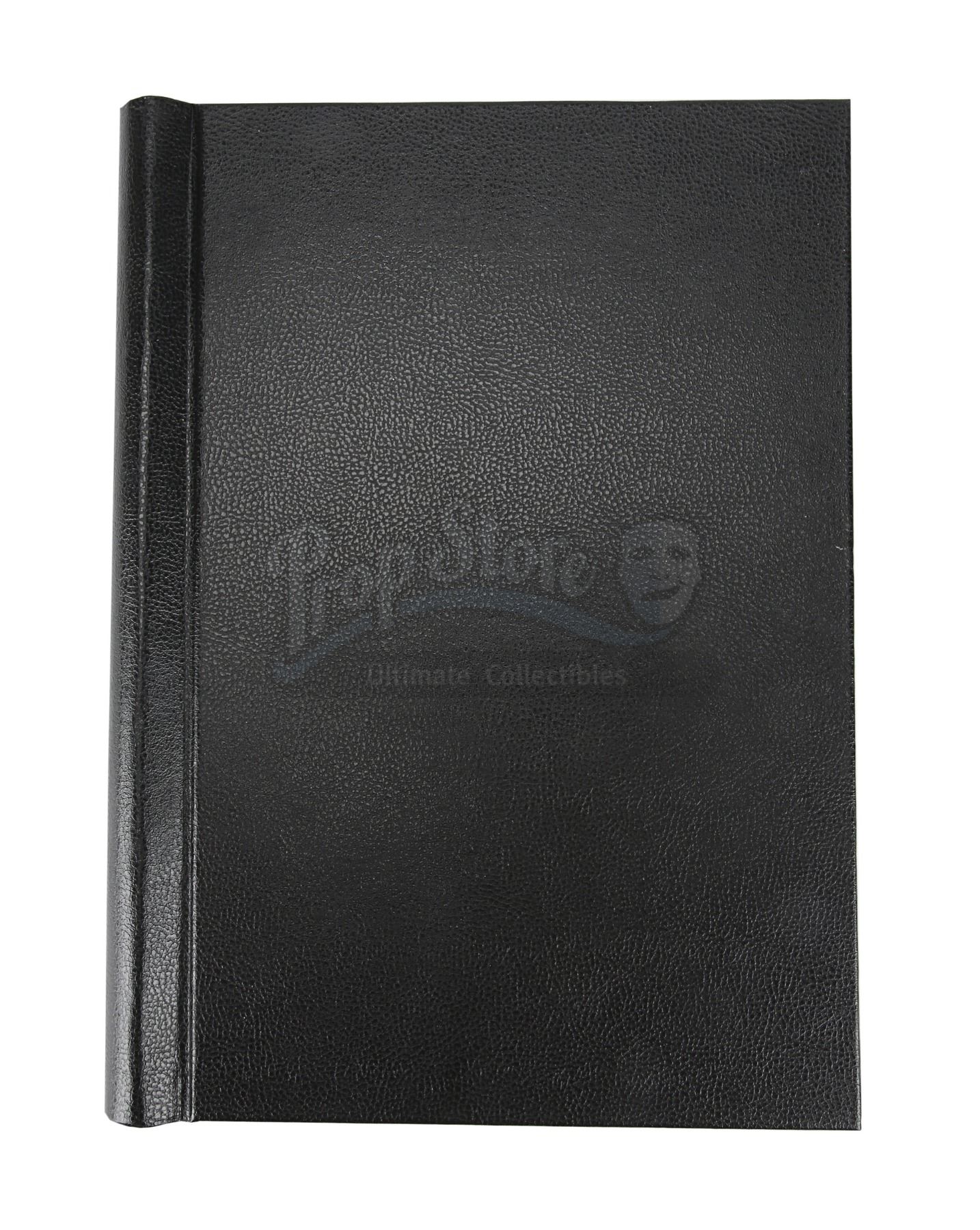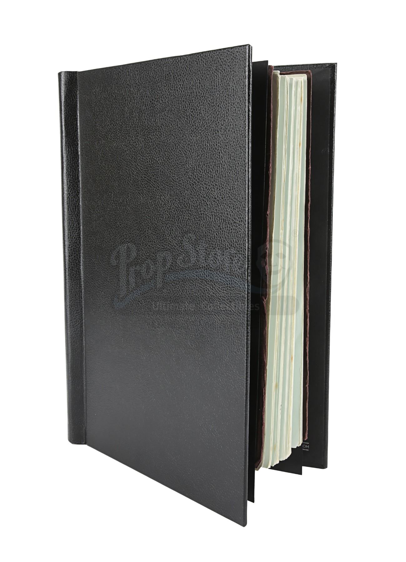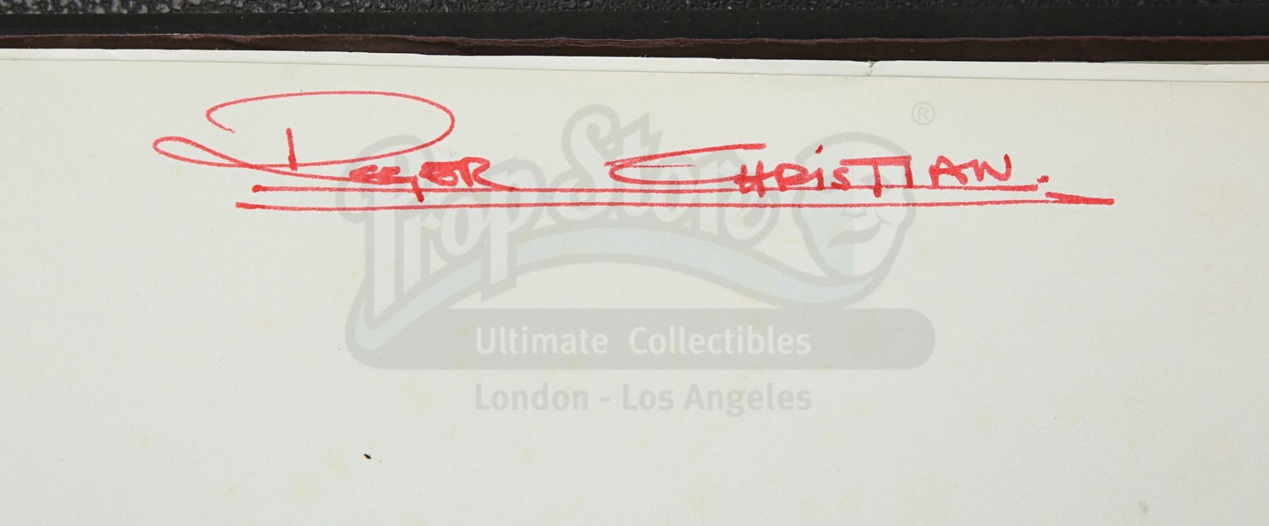 The script is 116 pages long, including the title and end pages, and is bound between its original brown card cover and a black leather hardback cover, added after production. "Roger Christian" is handwritten in red ink on the title page, and Christian has annotated the script in pencil, with notes detailing set dressing requirements and necessary props. The script has some wear from production use and age, including creasing and wear to the original cover. It is accompanied by a letter of authenticity from Christian himself. Dimensions: 32 cm x 23 cm x 3 cm (12 1/2" x 9" x 1 1/4")