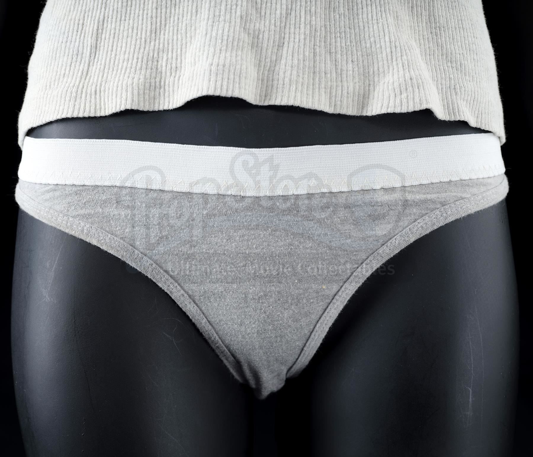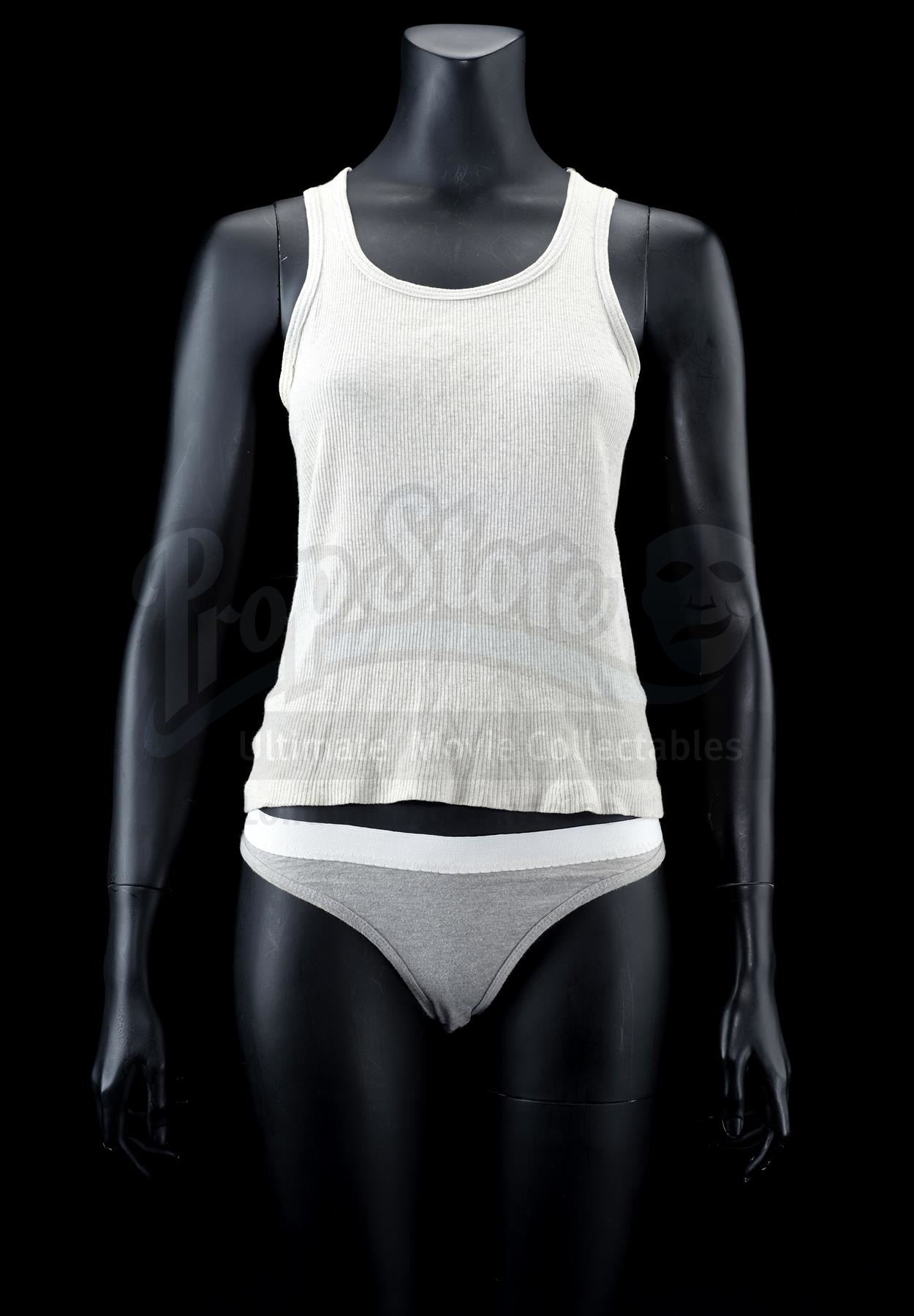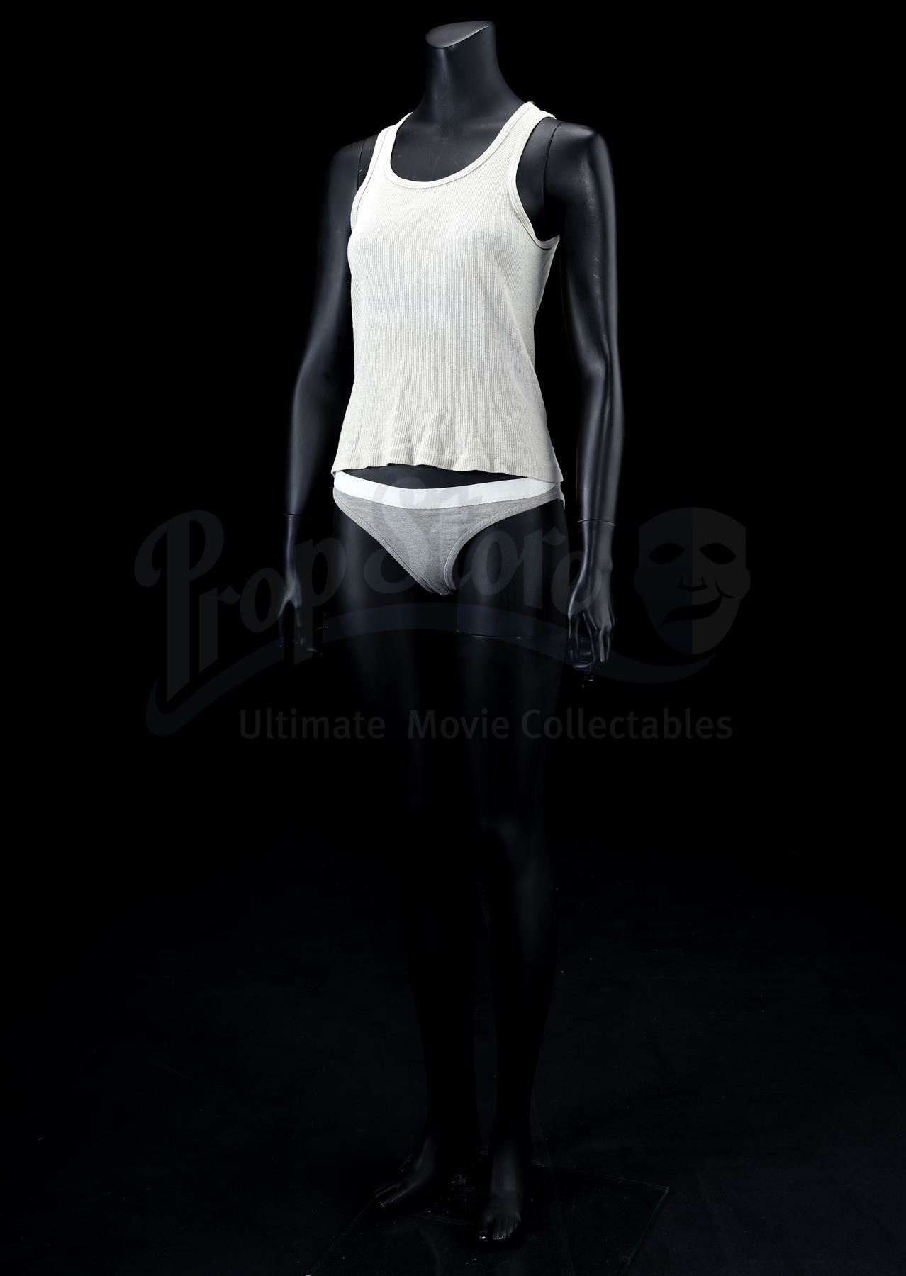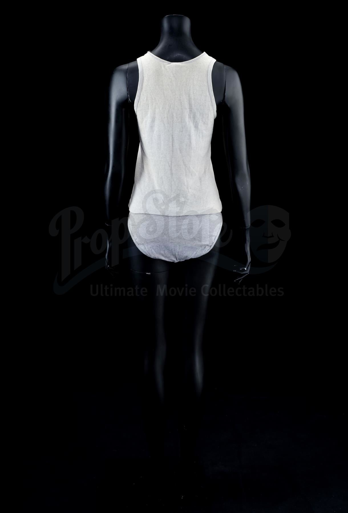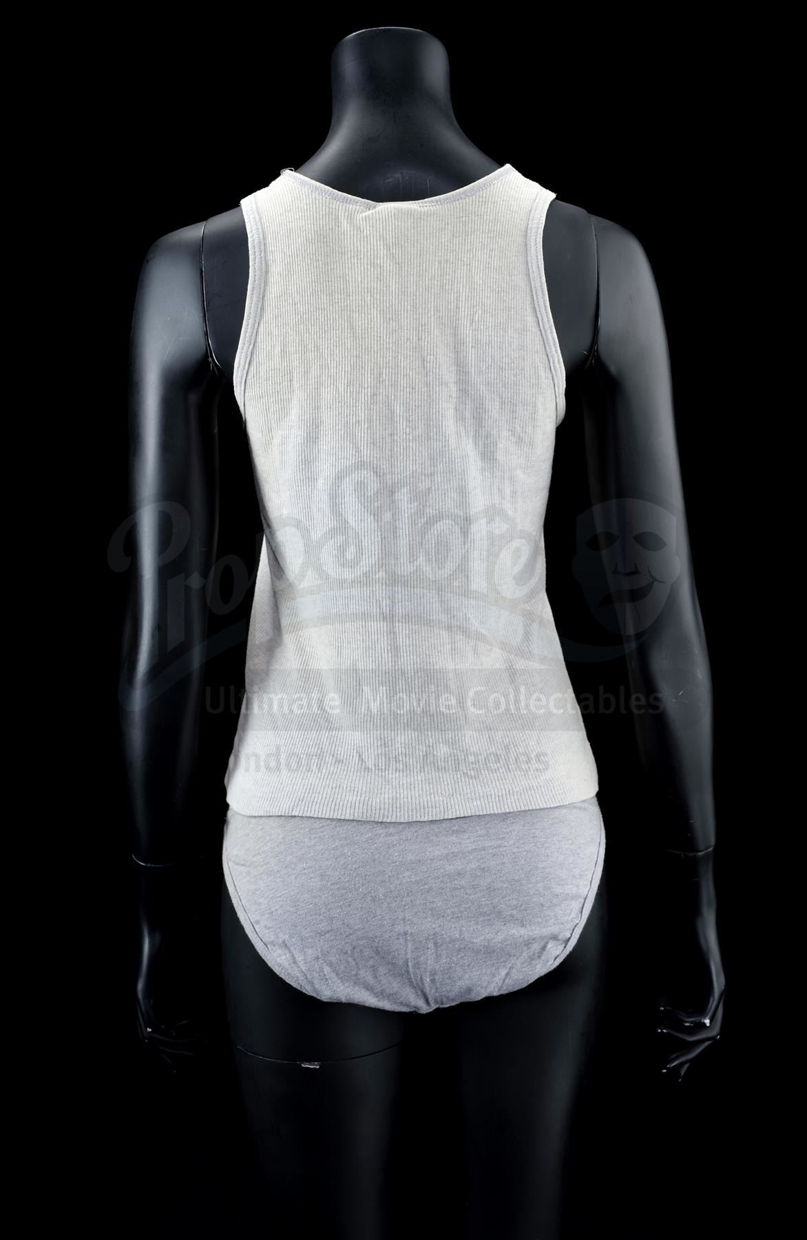 The costume includes a light grey rib-knit cotton tank top and grey briefs with a white elastic waistband. Both pieces exhibit subtle discolouration and some minor fabric pilling in the briefs.