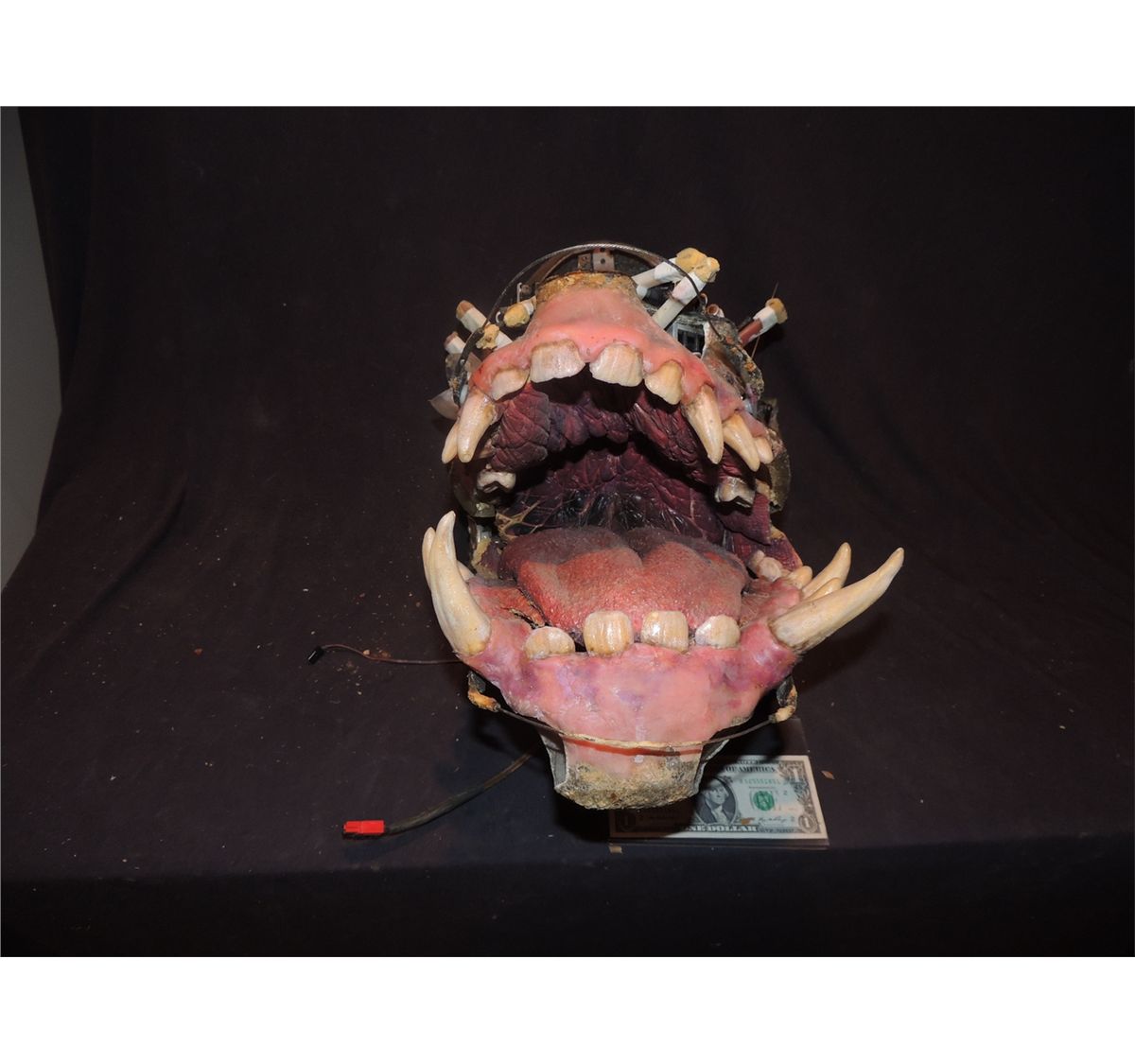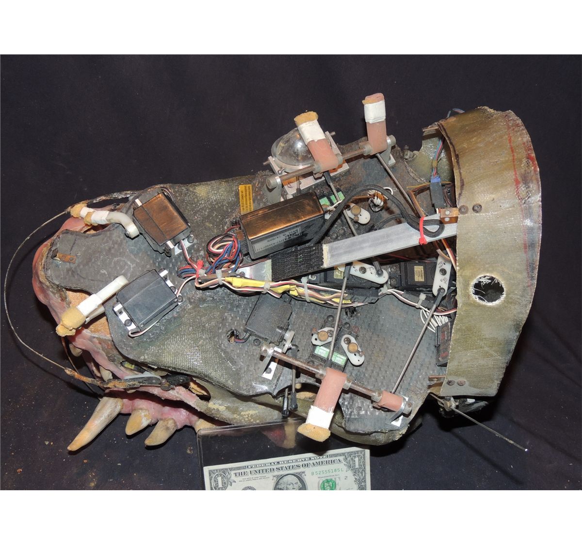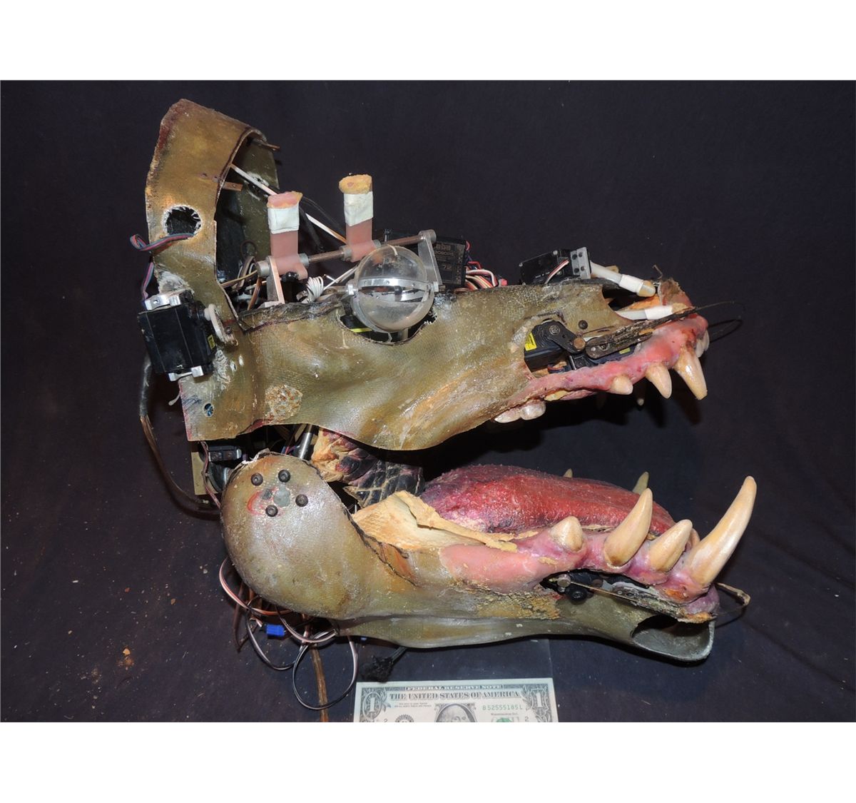 This is an incredibly cool animatronic monster or dragon under skull puppet with excellent teeth, and all of the mechanism & servos intact. The eyes and one lid are missing, but I count 24 servos with working mechanisms, and the signal boxes intact.
