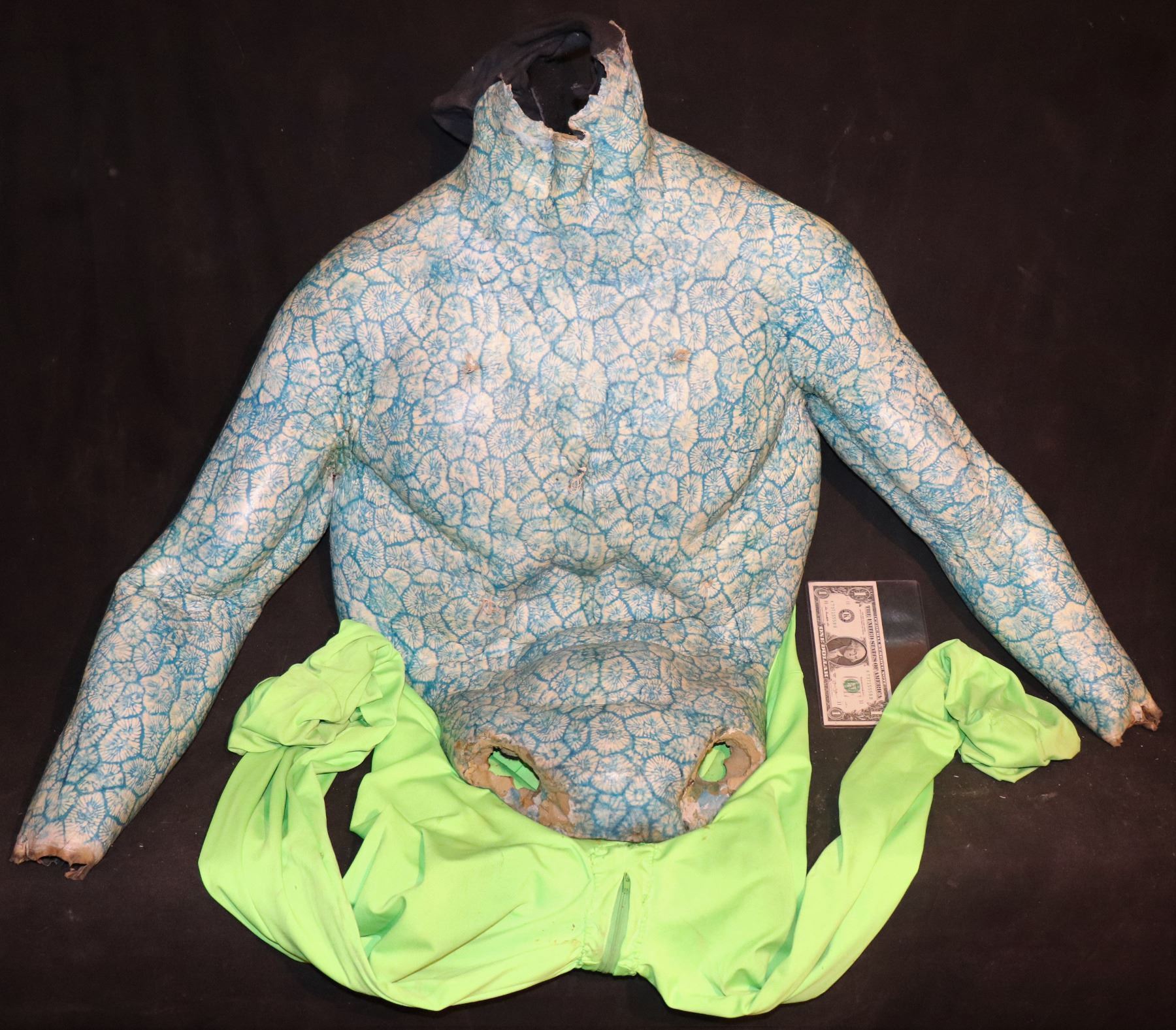 ALIEN CREATURE SUIT CHEST ON CHROMAKEY PANTS.