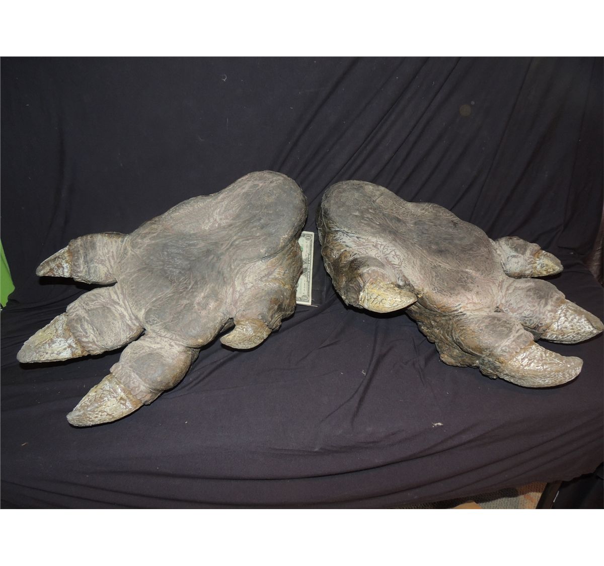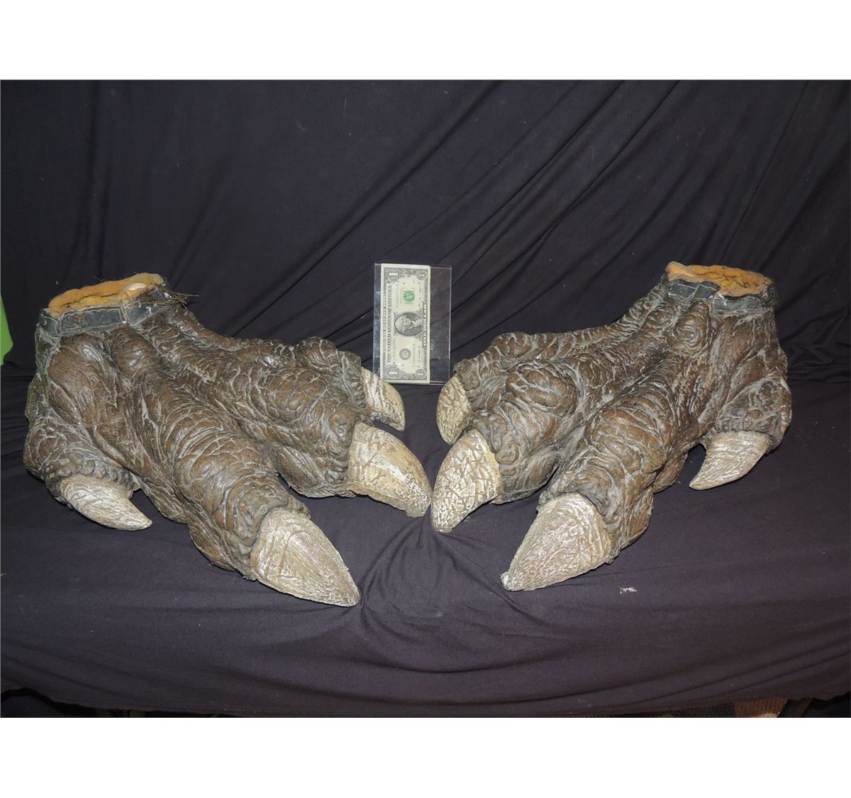 These are a very cool matched pair of wearable creature suit feet with huge claws from an unknown production. Made of poly foam filled latex on real shoes. Looks like a stunt set. All soft and sake materials. These match the hands, but are in much nicer shape, and much harder to find. Feet rarely come around! Never ones these nice!