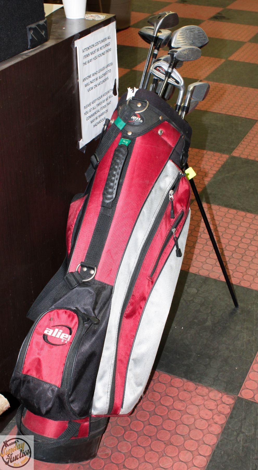 SET IN ALIEN GOLF CARRY BAG WITH STAND - GRAPHITE SHAFTS, OVERSIZE 10.5 DEGREE DRIVER, HYBRID FAIRWAY WOOD 3 AND 4 IRONS, 12-PIECES WITH PUTTER **ALL ITEMS MUST BE REMOVED BY 5PM SATURDAY, MAY 10TH 2025. ALL REMAINING ITEMS WILL BE SUBJECT TO A $6.00 PER DAY STORAGE CHARGE. ANY ITEMS REMAINING AFTER MONDAY, MAY 26TH 2025 WILL BE CONSIDERED FORFEITED. NO REFUNDS WILL BE ISSUED FOR FORFEITED ITEMS. TO SCHEDULE A PICK UP APPOINTMENT CLICK HERE