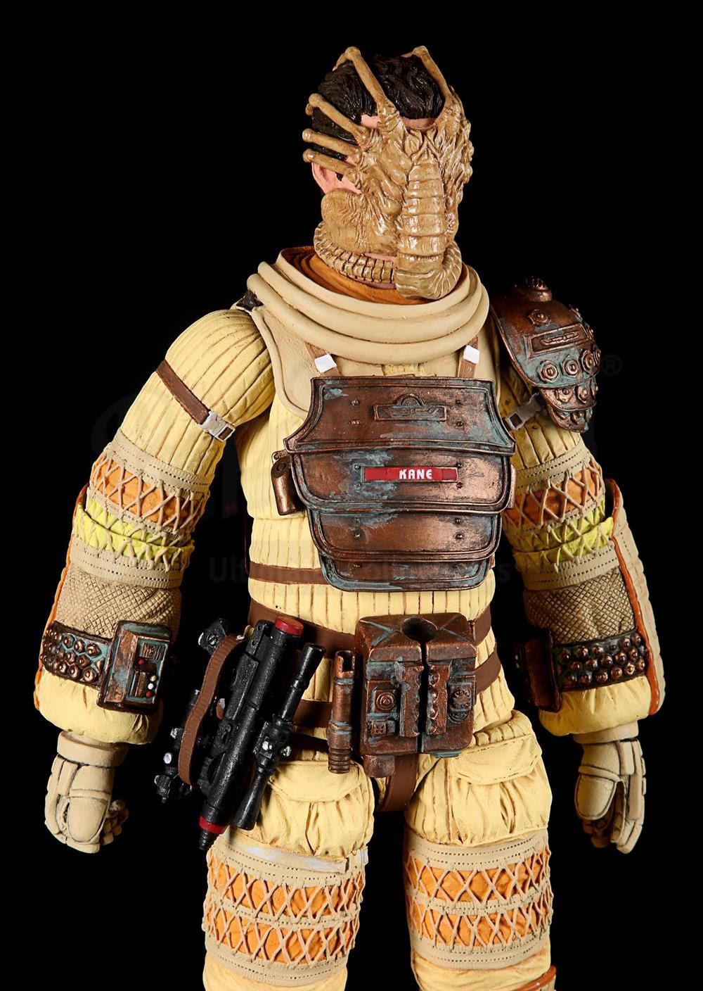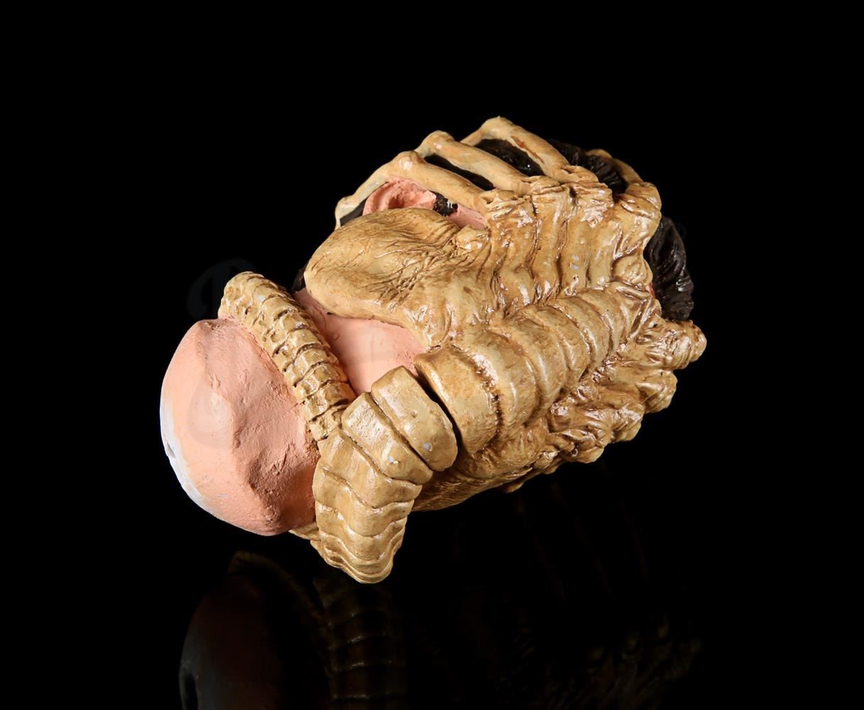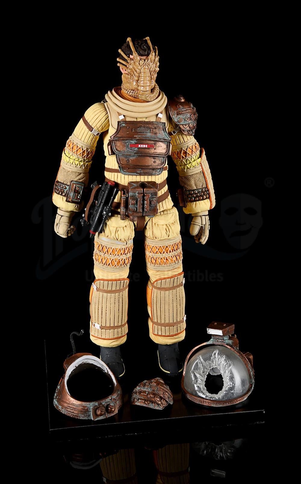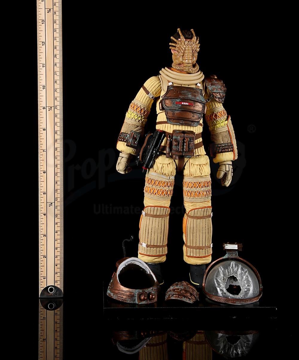 2:1 scale hardcopy prototype of Kane in Nostromo suit from Series 3. Painted in similar colour scheme. Complete with separate components including feet, shoulder armour piece, tube, two-piece helmet, visor and head with facehugger wrapped around. Comes with black base. This lot is fragile and should be handled with care.