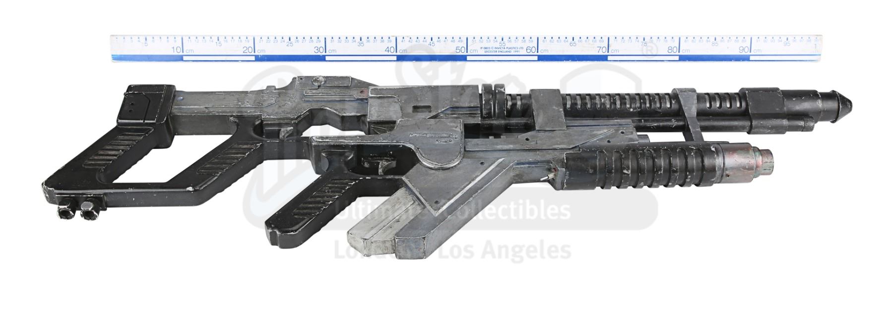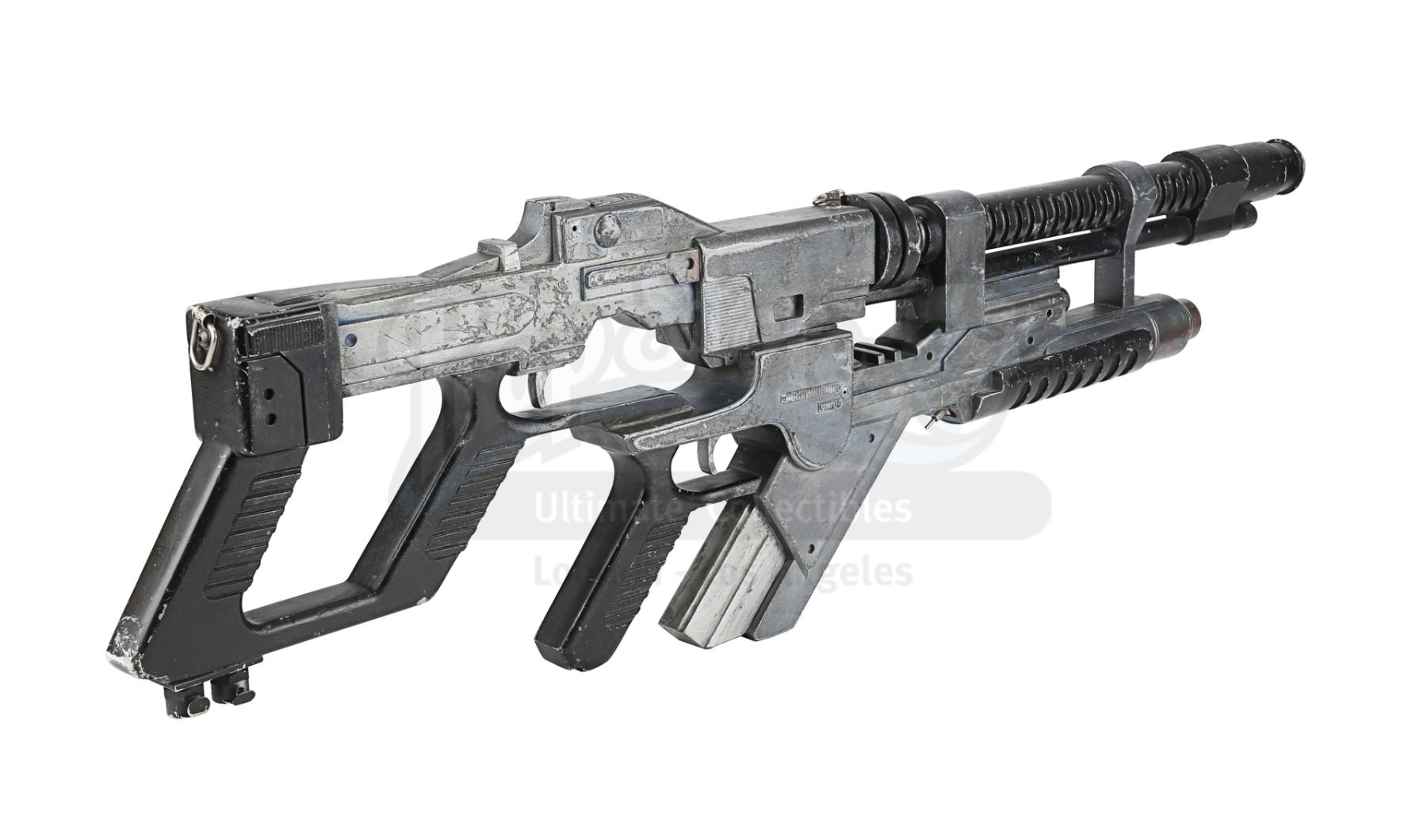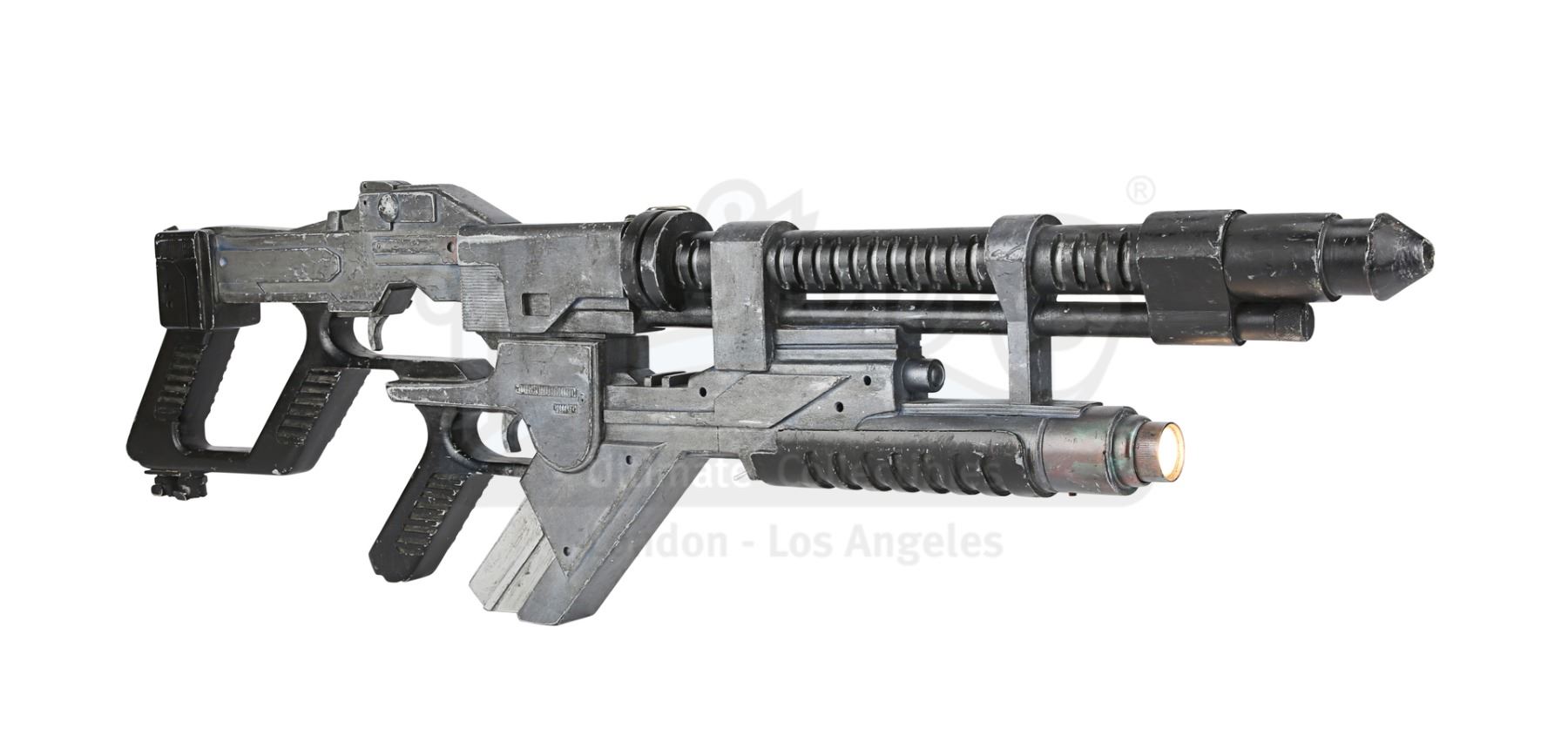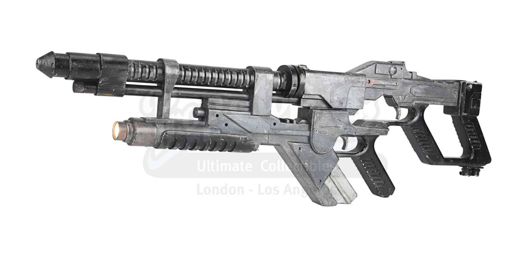 A light-up AR-2 rifle from Jean-Pierre Jeunet's sci-fi sequel Alien Resurrection. AR-2 rifles were carried by Marines aboard the USM Auriga, and then picked up by the crew of the Betty after the xenomorphs escaped. The rifle has three firing modes in the film: assault rifle, flamethrower and grenade launcher. Ripley (Sigourney Weaver) used the flamethrower function to destroy her seven previous failed clones.
