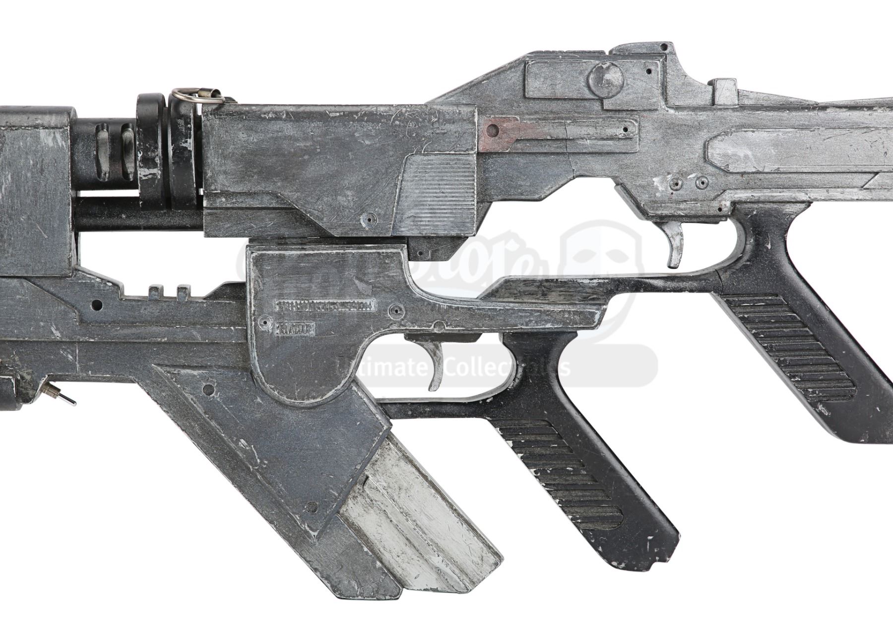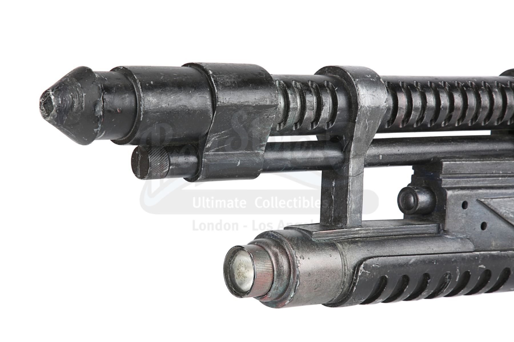 The weapon is predominantly made of resin and is painted faux-silver and black. It features a torch on the front, which is powered by three 3V batteries and illuminated by flicking the metal switch located in front of the magazine. It has two metal loops at the top for mounting a sling. The rifle has some wear from production use, with considerable scuffing and scratching to the paintwork and some denting to the resin. Dimensions: 98 cm x 6 cm x 31 cm (38 1/2" x 2 1/4" x 12 1/4")