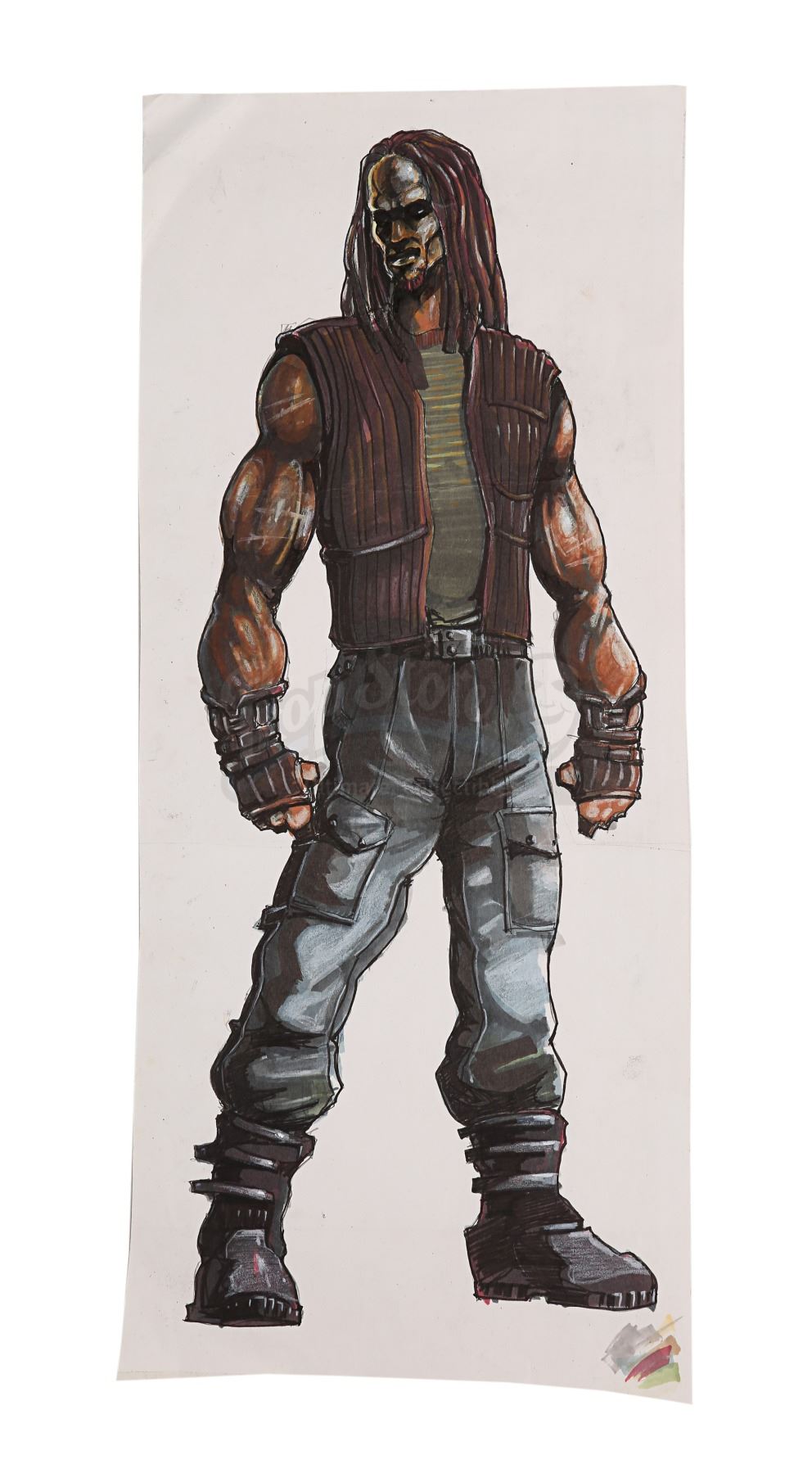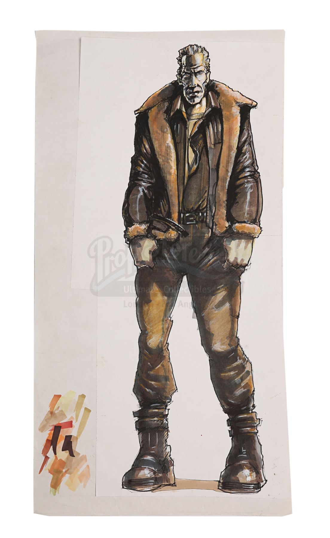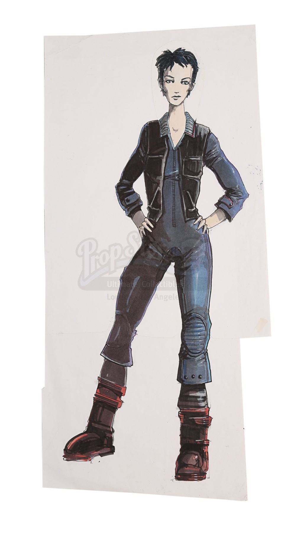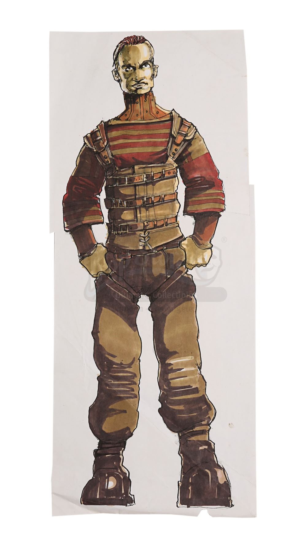 The characters' costumes were conceived by Oscar-nominated costume designer Bob Ringwood and rendered by artist Mariano DiÂaz on paper in pencil, pen and watercolours. Each image comprises several pieces of paper adhered together, while the composite and badge designs are printed on paper. The costume designs come in plastic sleeves with stickers labelling each character. The designs have some wear from production use and age, including some minor tears, creasing and staining. Dimensions (largest design): 51 cm x 26 cm (20" x 10 1/4"); (composite): 28 cm x 37 cm (11" x 14 1/2")