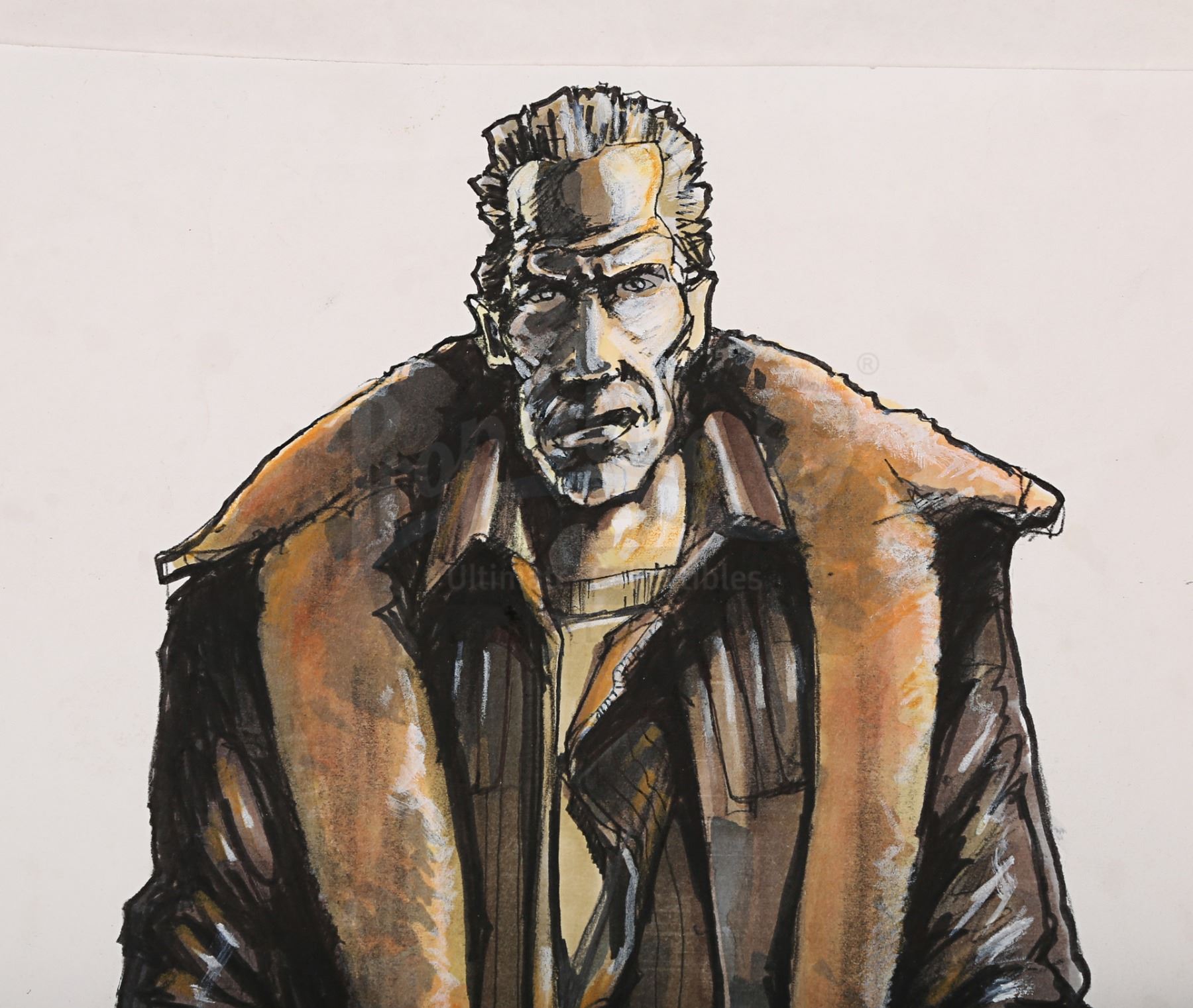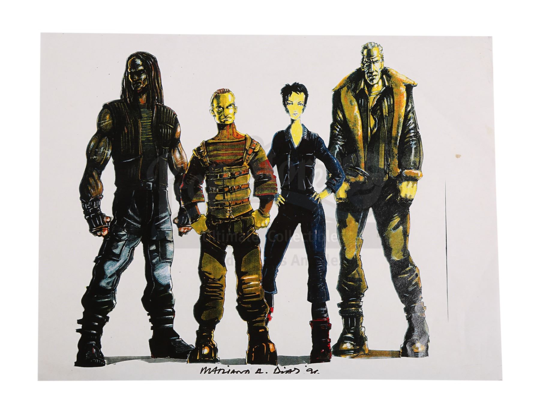 A set of character design artworks and a pair of design prints from the production of Jean-Pierre Jeunet's sci-fi sequel Alien: Resurrection. The set features hand-drawn artwork depicting four of the main characters - Call (Winona Ryder), Vriess (Dominique Pinon), Johner (Ron Perlman) and Christie (Gary Dourdan) - as well as a composite print of the four together and a printed Weyland-Yutani badge design.