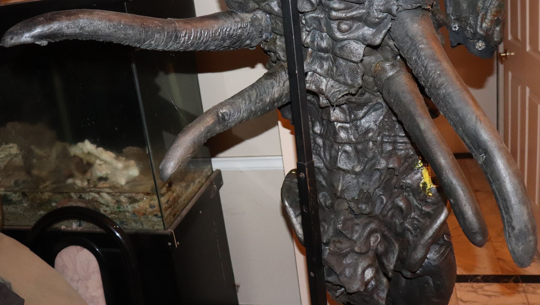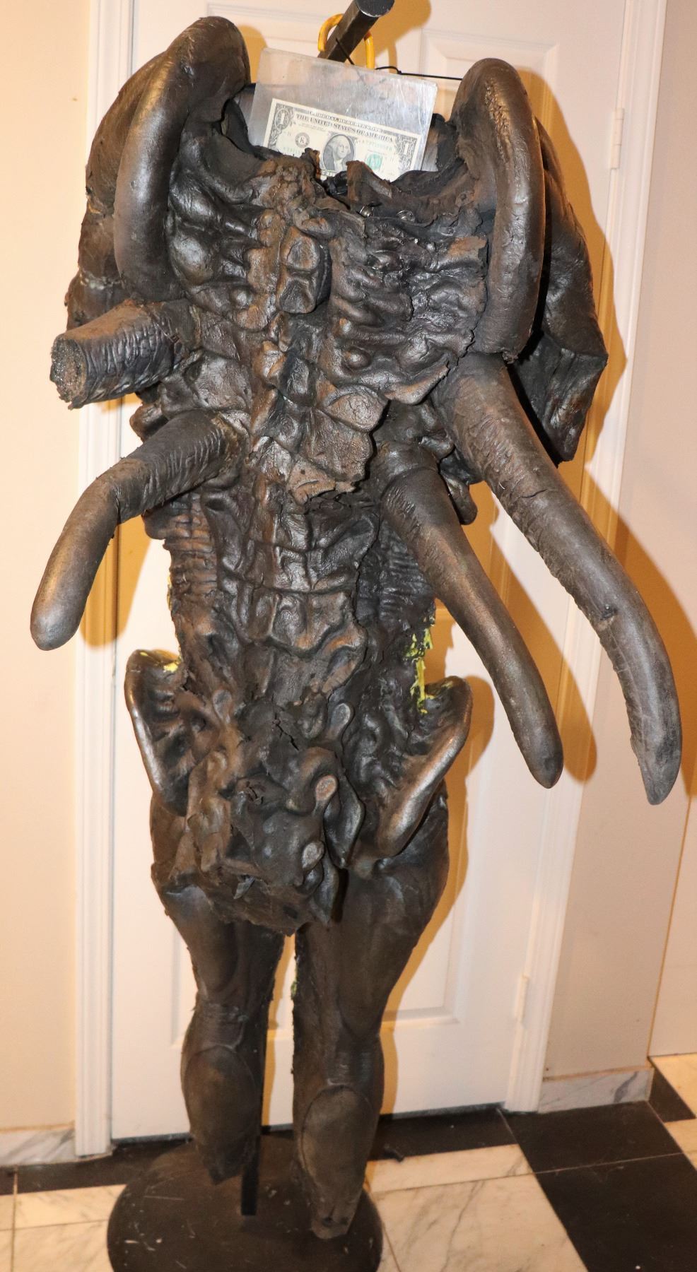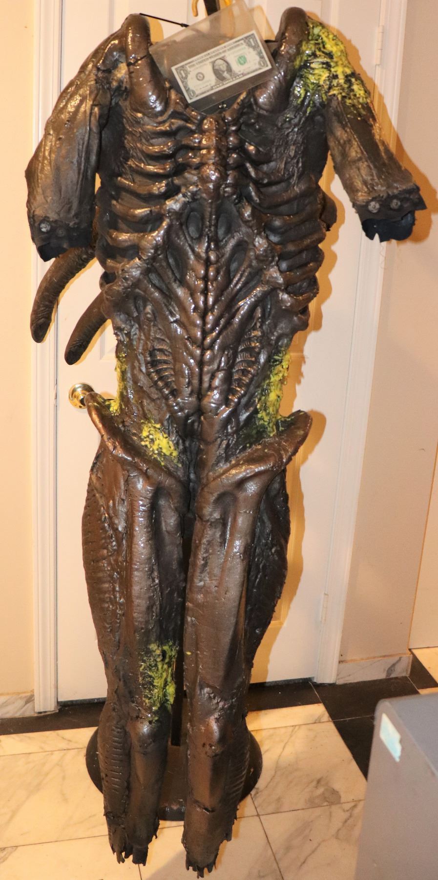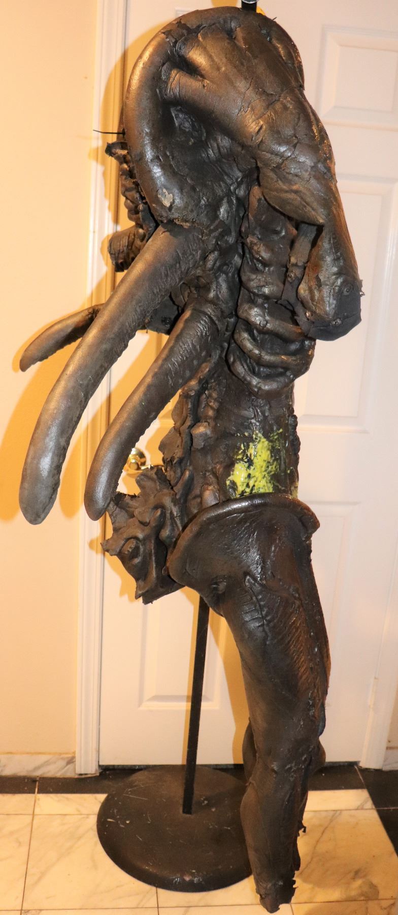 This was a Squib suit used in scenes where Aliens are shot by Predators. Still has Alien Blood on it. This is actually reasonably supple but there are some dry areas. I replaced the broken horn.
