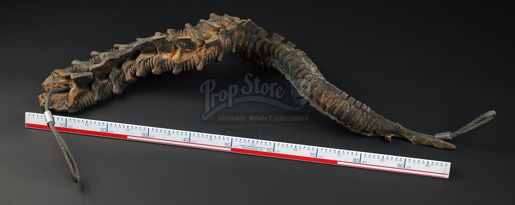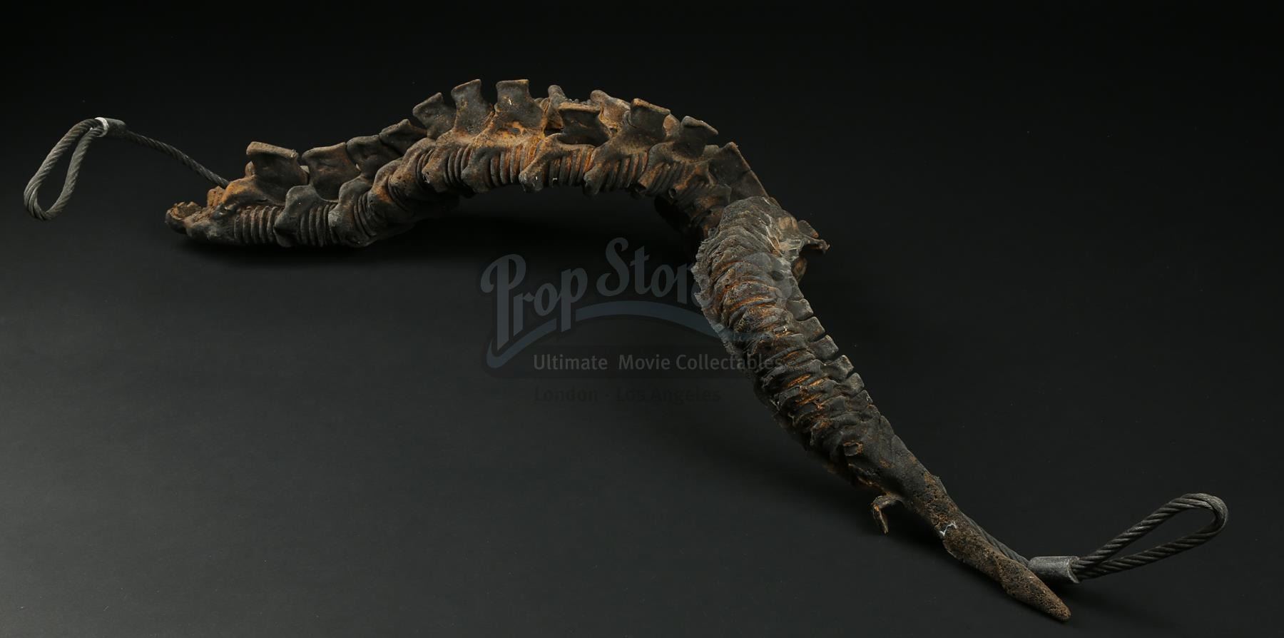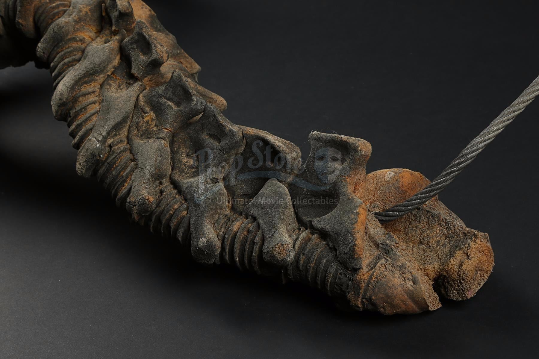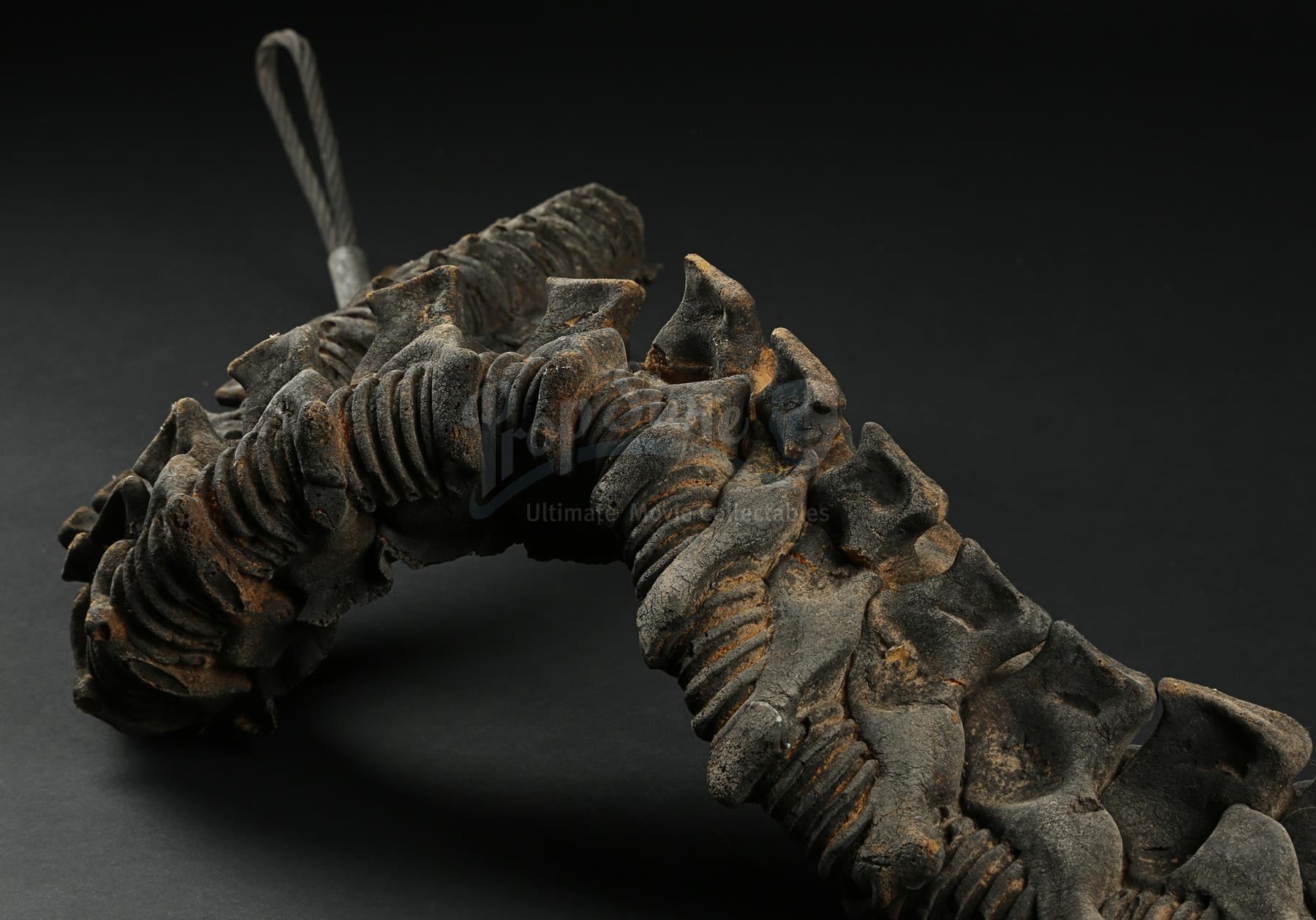 The tail is made from polyfoam that has been moulded into a sequence of vertebrae flowing from large to small, decorated in a shade of brown and taking the classic 'bio-machine' shape, as imagined by artist H.R. Giger. Threaded through the entire length, is a thick steel wire cord, which would have allowed the tail to support the weight of a performer for a special effect. There are small cracks, flaking paint and some small missing chunks from extensive production use. The cable has developed a curved 'S' shape through storage and rests in this position naturally. Dimensions: 132 cm x 22 cm x 16 cm (52'' x 8 1/2'' x 6 1/4'')