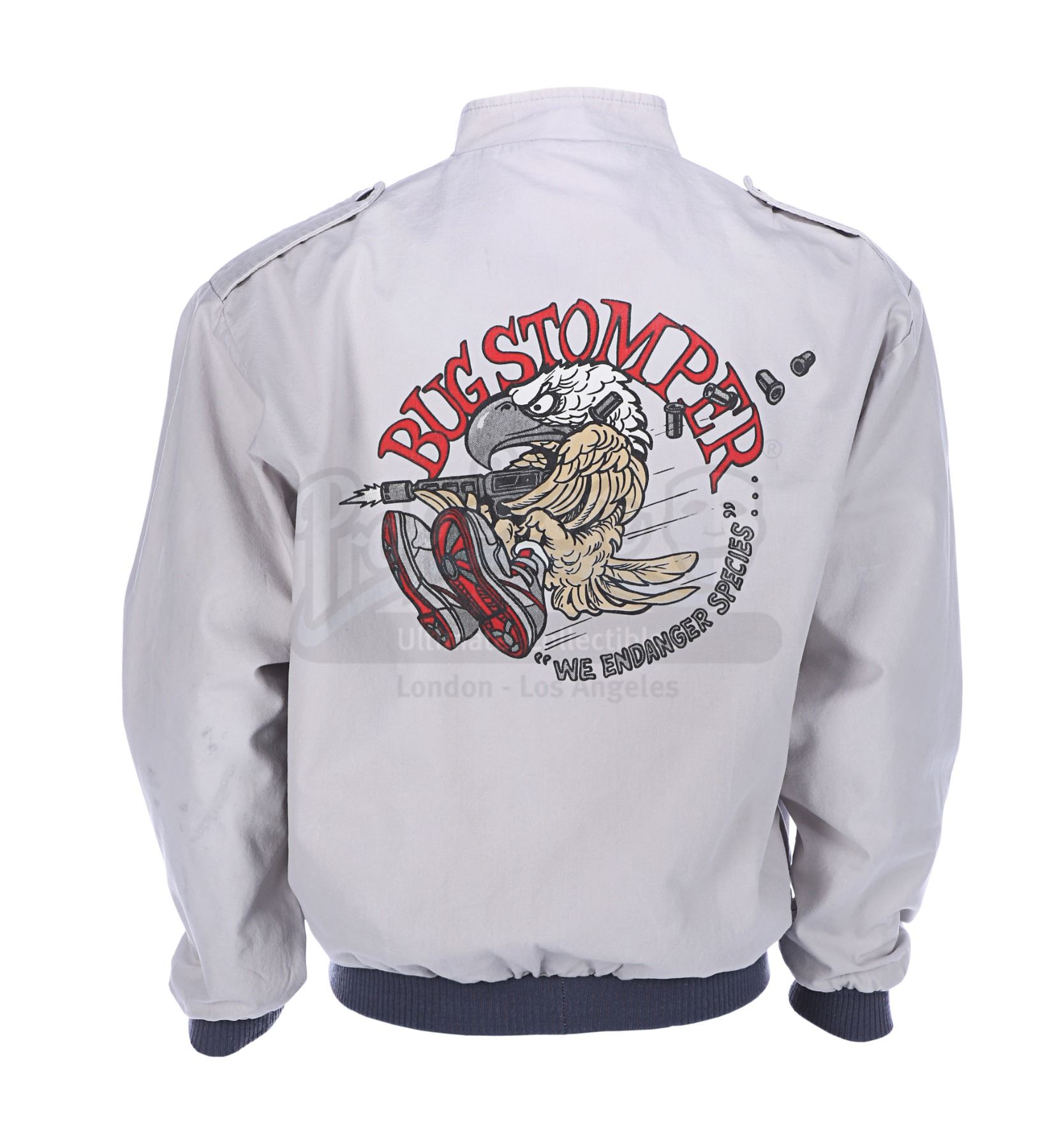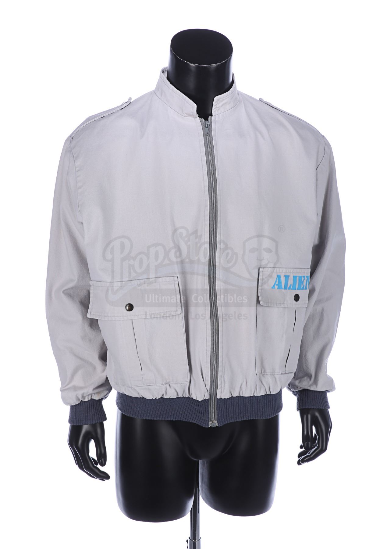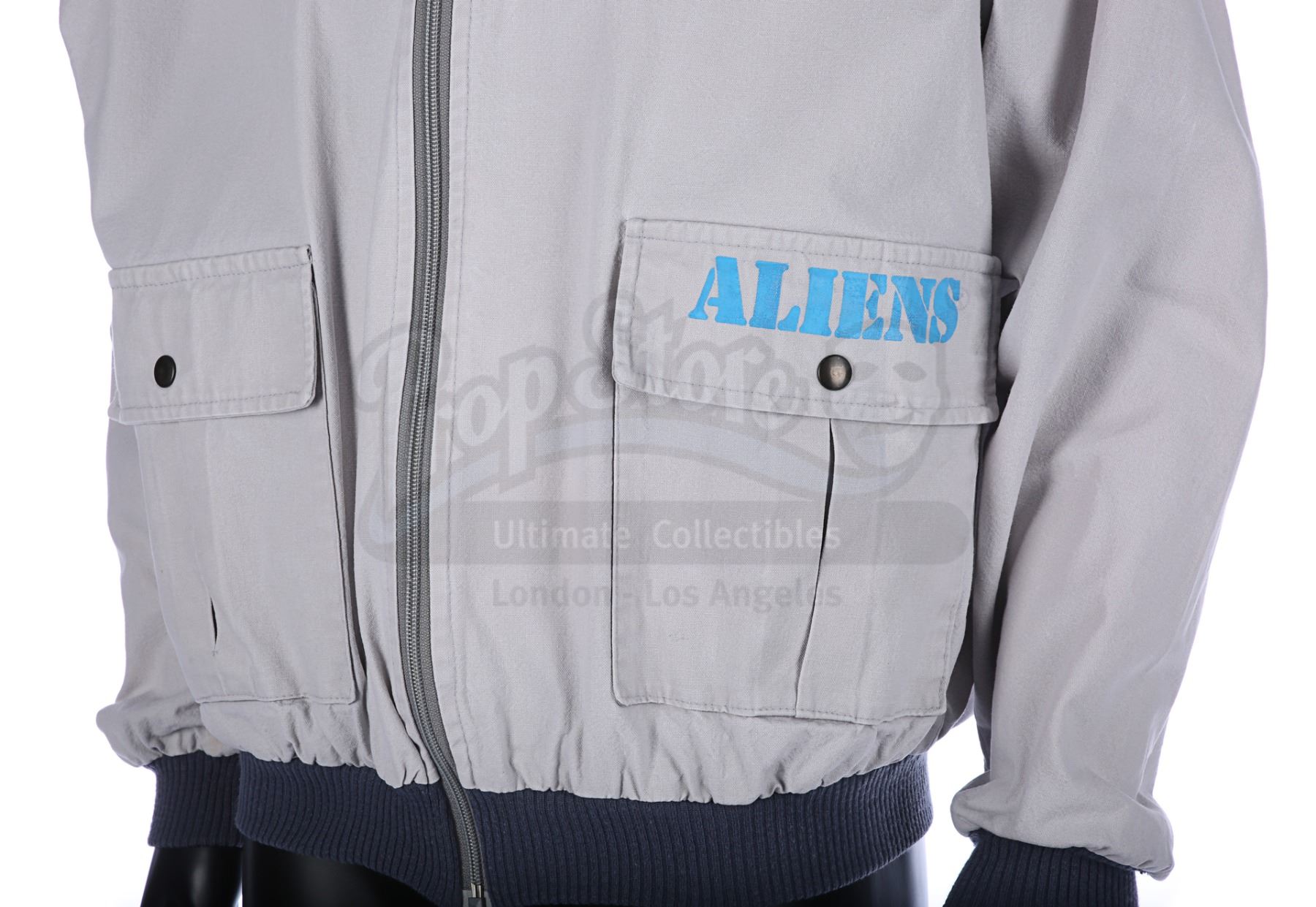 A Reebok Bug Stomper jacket from the production of James Cameron's sci-fi action sequel Aliens. Made of grey cotton, this lightweight crew jacket features a zip front closure, knitted waistband and cuffs, epaulettes, and a pocket on each hip. The Aliens title is printed in blue on the left hip pocket and the distinctive Bug Stomper artwork - seen on the nose of the Colonial Marines' dropship in the film - adorns the back. The lot has no sizes marked and displays some minor staining on the left sleeve.