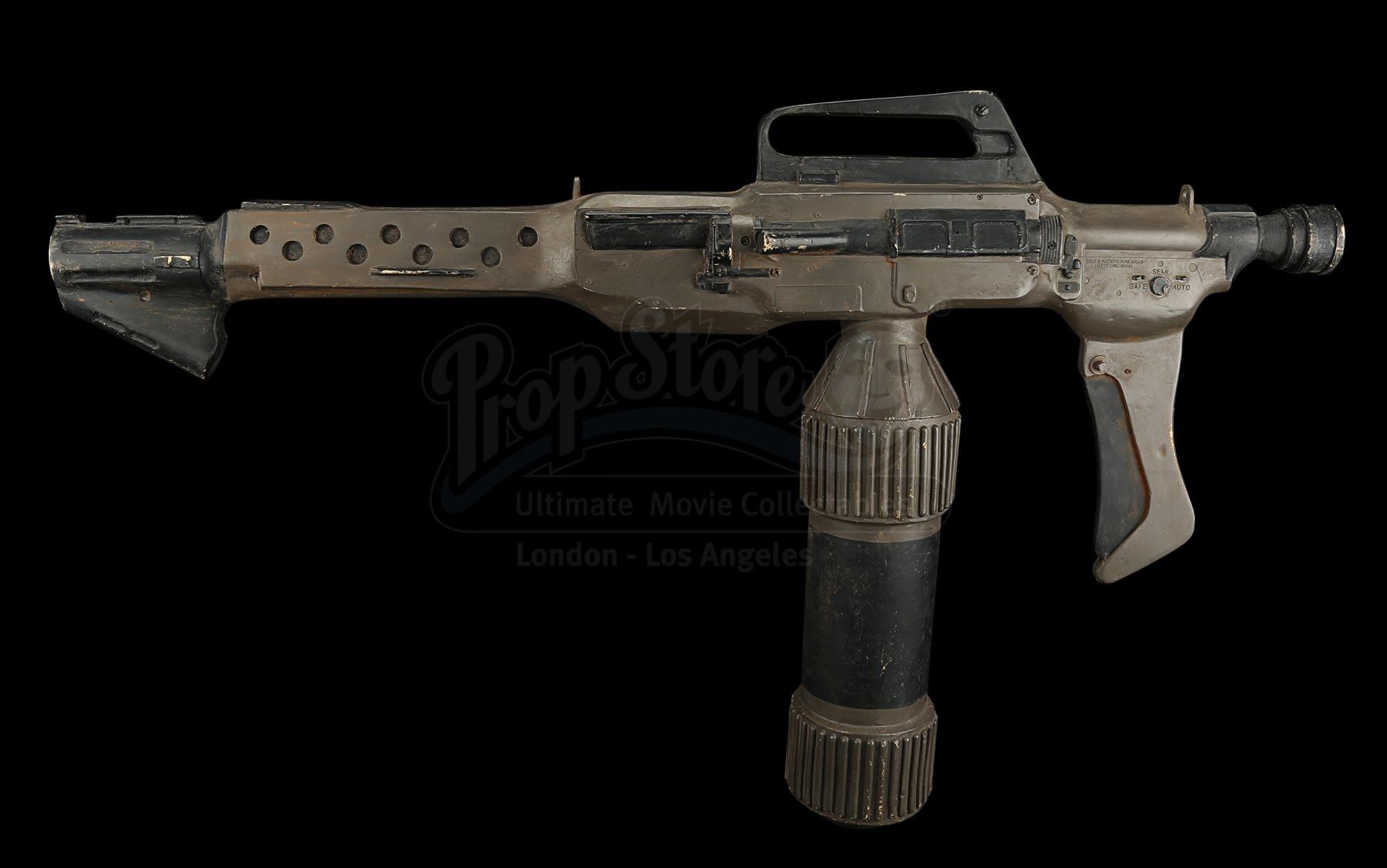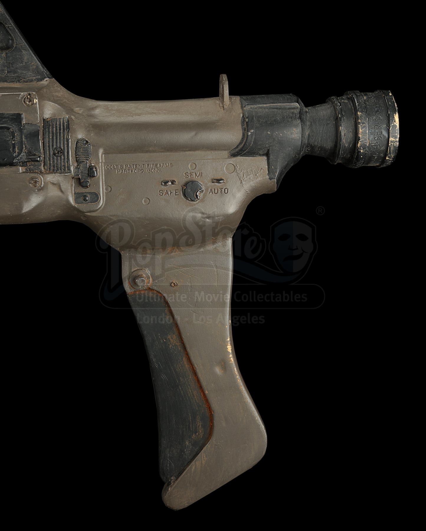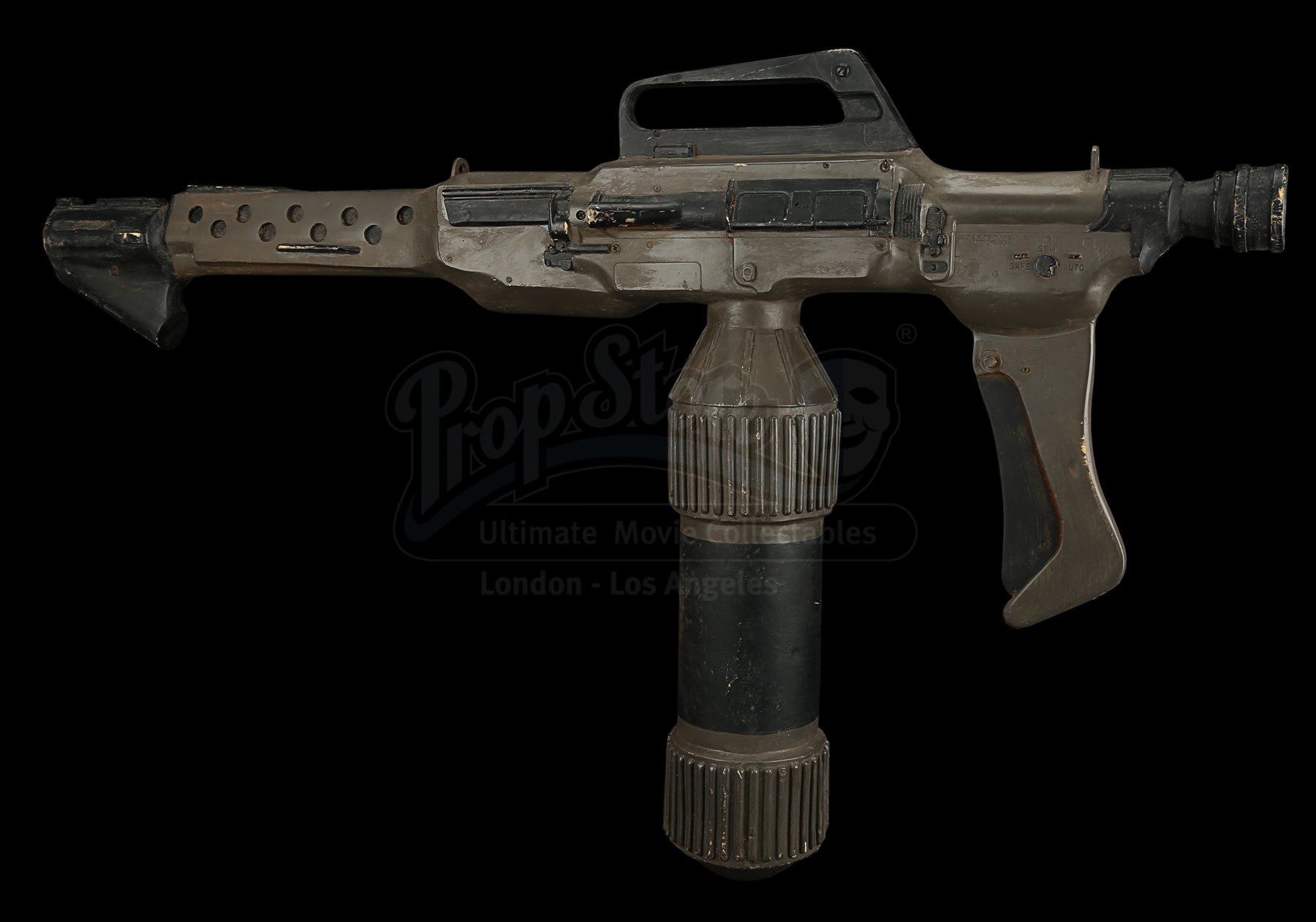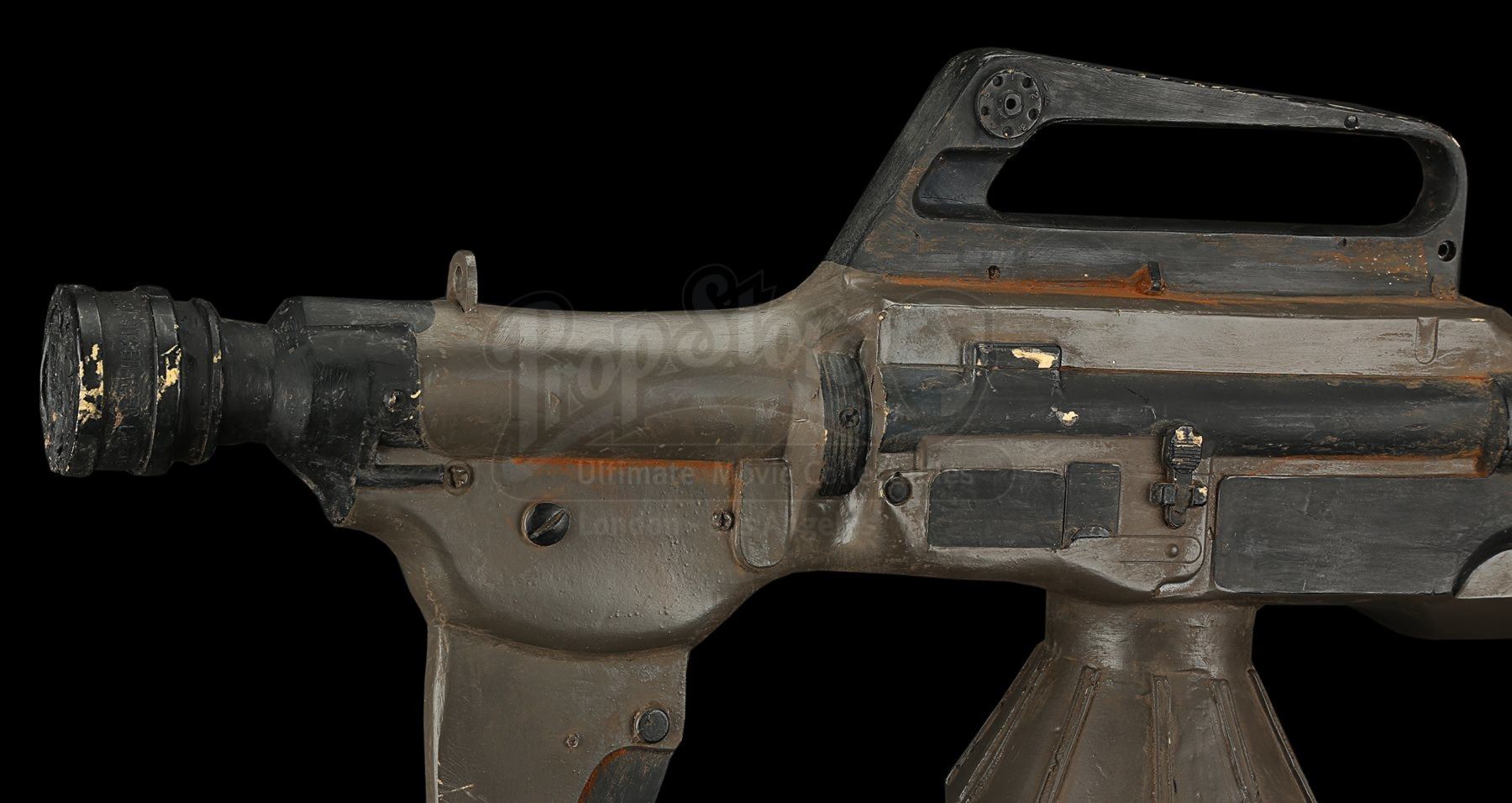 SFX supervisor John Richardson and conceptual designer Ron Cobb created several different versions of each weapon for production. This item is loosely based on existing military hardware, consisting of two M16 rifles spliced together, while the front section is based on an M203 grenade launcher with its handle and receiver sections evident at the centre. A Colt Patent Firearms logo is embossed near the butt end.