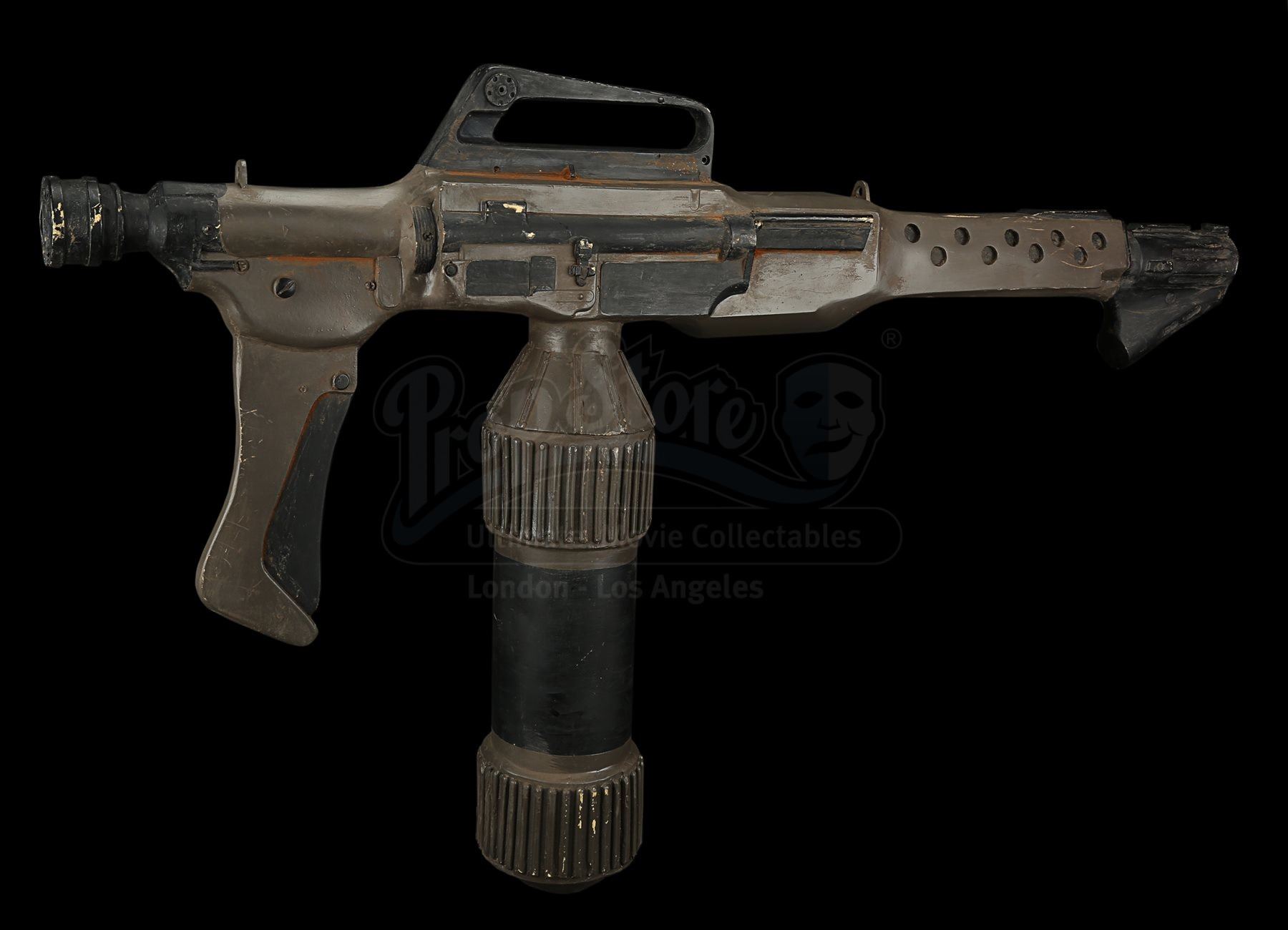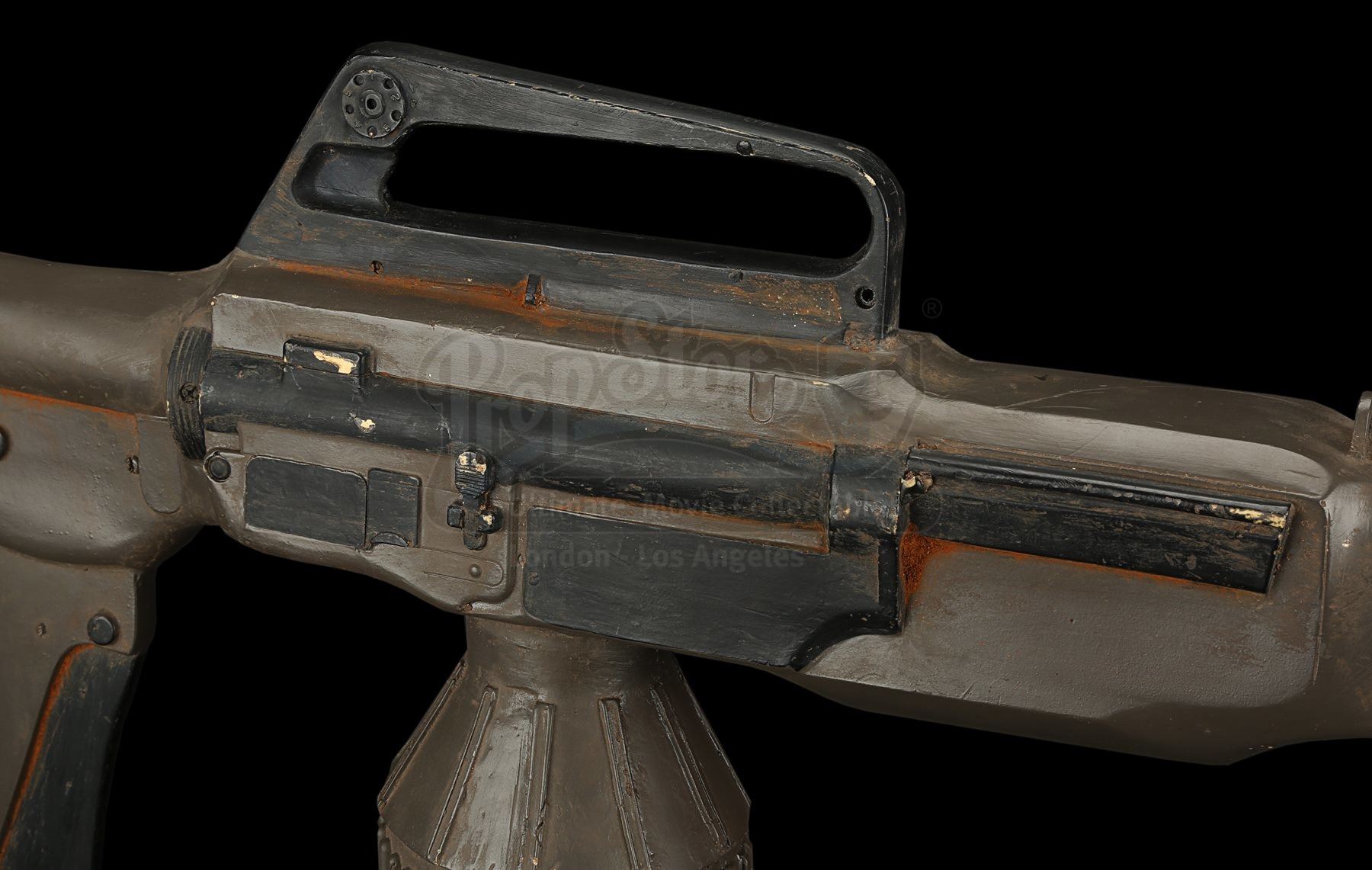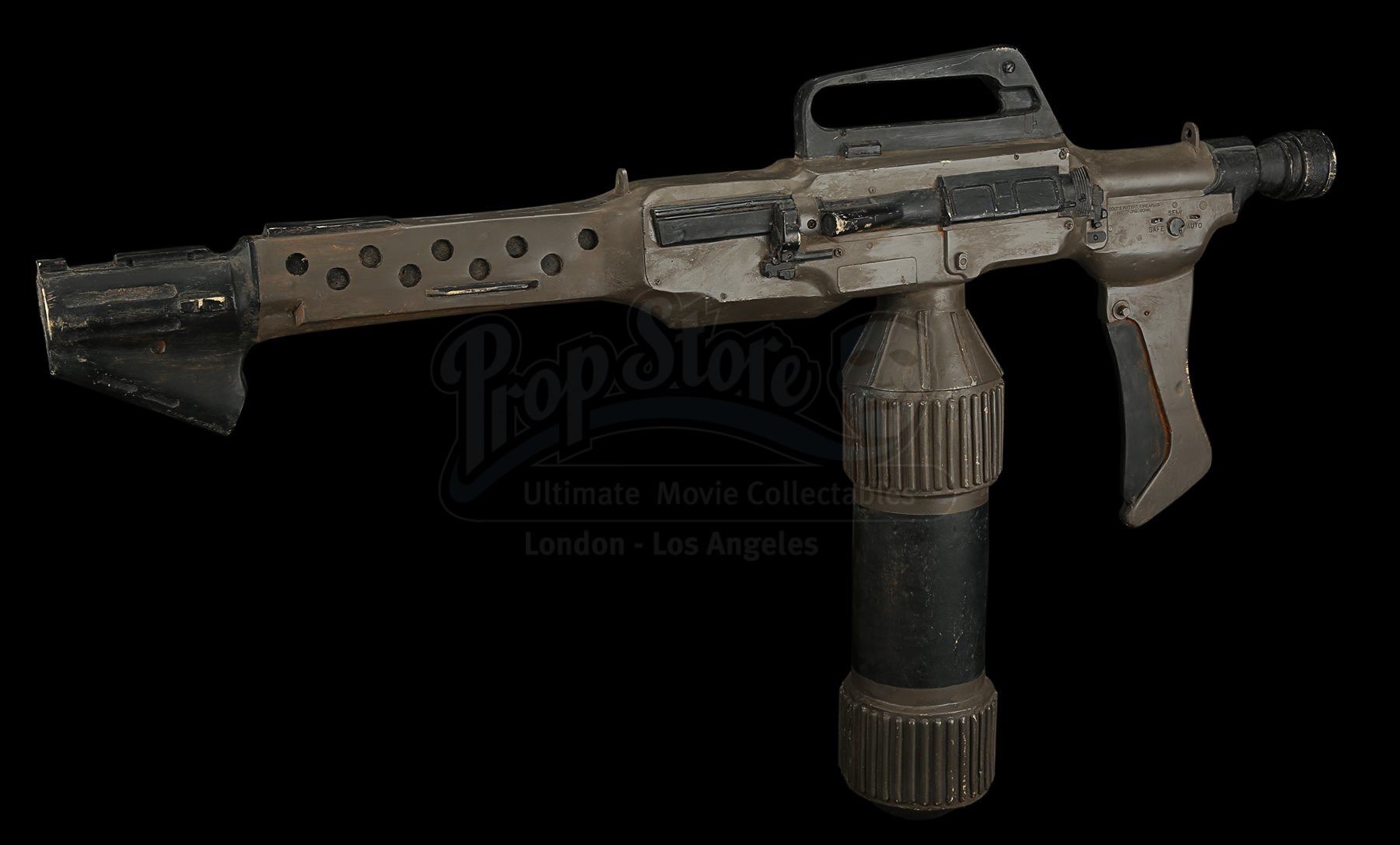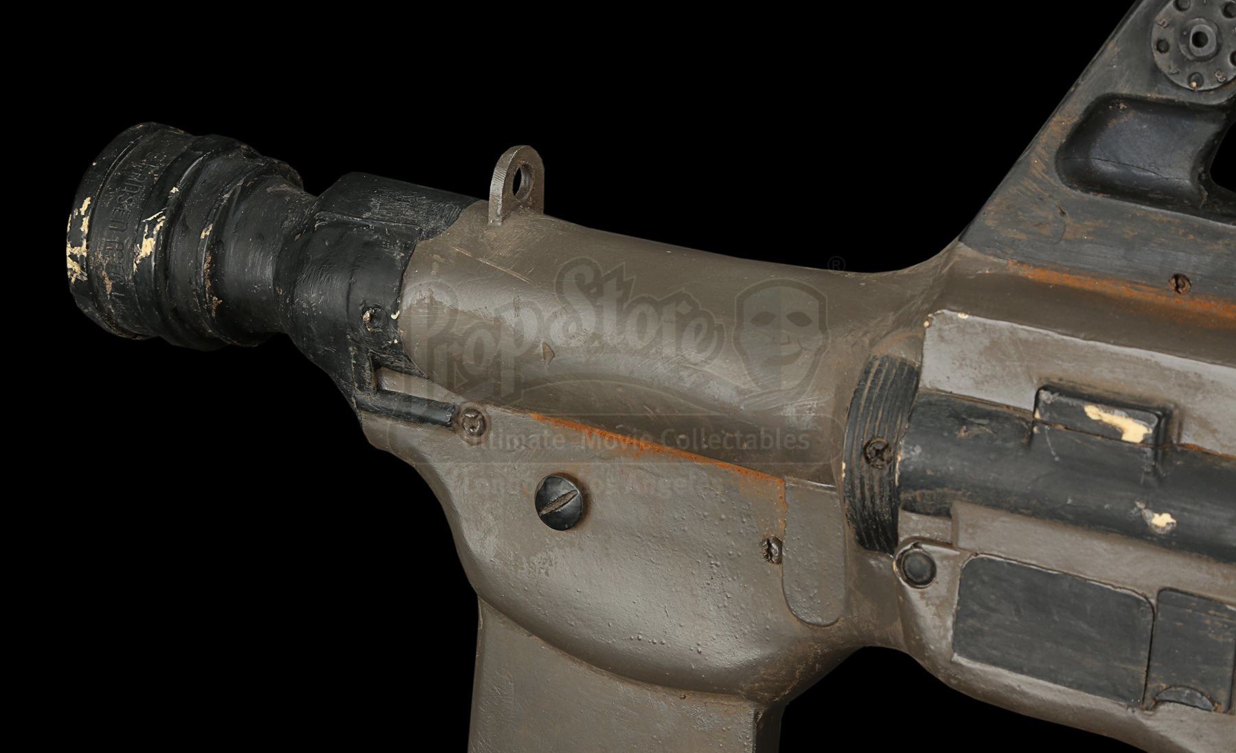 SFX supervisor John Richardson and conceptual designer Ron Cobb created several different versions of each weapon for production. This item is loosely based on existing military hardware, consisting of two M16 rifles spliced together, while the front section is based on an M203 grenade launcher with its handle and receiver sections evident at the centre. A Colt Patent Firearms logo is embossed near the butt end.